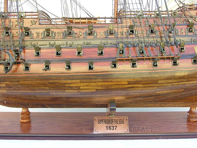 H.M.S. Sovereign of the Seas, launched in 1637, was the most powerfully armed ship in the world in its day. It was originally going to have 90 guns, but King Charles I personally insisted that a "great ship" be built for the English Royal Navy, so it went to sea with 102 bronze guns. The vessel was the most extravagantly decorated warship in the Royal Navy, completely adorned from stern to bow with gilded carvings. The ship was later renamed Sovereign and then Royal Sovereign. It was destroyed by fire in 1697 in Chatham.