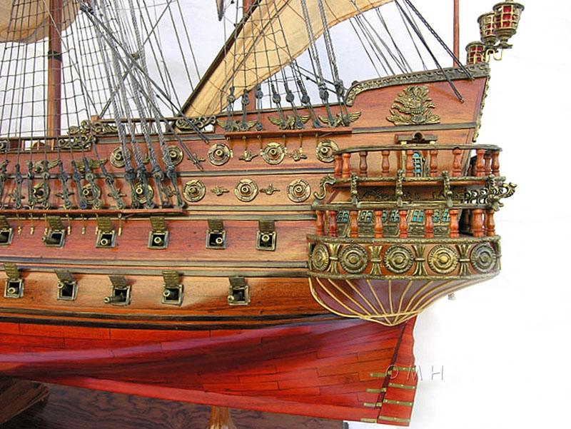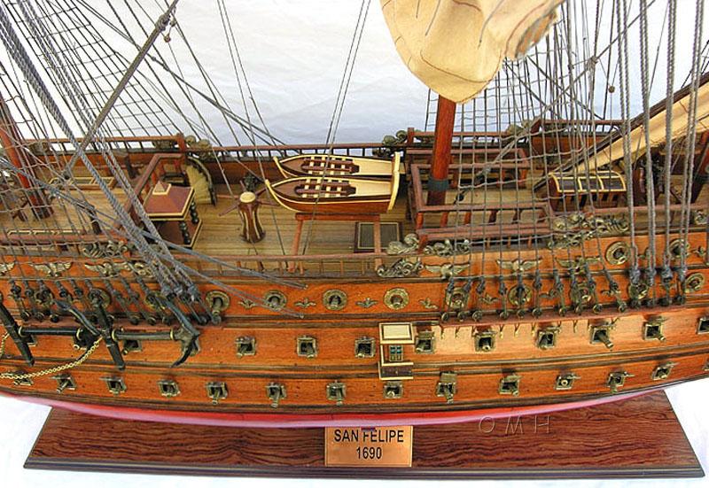 This is one of a kind, a gorgeous model of the San Felipe. All details are handcrafted from beautiful wood such as mahogany, teak, rose wood and other exotic wood. The hull is constructed using plank on frame method, each strip of exotic wood are carefully join together to form a smooth hull. This model is completely hand built to spec by skillful and creative master craftsmen; you will be amazed at how real it looks. On the ship, you will spot amazing components such as: wooden bowsprit, foremast, mainmast, and mizzen mast. They are all connected to numerous fabric sails with detailed stitching, all rigging are painstakingly fastened by hand in matching colors. And of course, this model was built according to scale through original plans, pictures and drawings. Limited edition. Weve only built 5 of these so far.