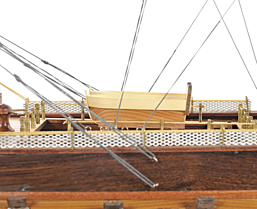 Are you looking for a perfect display combination? Our HMS Surprise 37” model and tabletop display case combo will sure to set your home or office apart! The Model: Our spectacular HMS Surprise model is handcrafted from beautiful wood such as rosewood, mahogany, teak, and along with various other exotic wood. The hull is constructed using a plank on frame method, each strip of exotic wood are carefully joined together to form a smooth hull. This model is completely hand built to spec by skillful and creative master craftsmen; you will be amazed at how real it looks. The ship has a clear varnished coating follow with amazing details. On the ship, you can come across incredible features such as wooden bowsprit, foremast, mainmast, and mizzen mast. They are all connected to numerous full-size fabric sails with detailed stitching, all rigging are painstakingly fastened by hand in matching colors. On the main deck, you will come across 2 wooden boats situated in a large rectangular area with 2 wooden bunkers, a wooden/metal steering wheel, and a wooden bunker with a telescope. On the poop deck, there’s navigational area with 2 metal steering wheels for the captain and 1 wooden cabin. There are metal railings surrounding the beak deck area toward the quarter deck area. You can easily spot 2 rows of numerous metal cannons on both side of the hull. In addition, you will find supplementary crafted metal parts on the ship such as anchors, lantern, statues, and much more...There’s also a wooden rudder held with metal to help the ship maneuver in the right direction. An attached wooden stand with a nameplate engraved “HMS Surprise 1794” is standard on this model. Our model was built according to scale through original plans, pictures, and drawings. We absolutely use no plastic parts only the highest quality wood and metal parts. Our HMS Surprise model comes fully-assembled and ready to be displayed. The Display Case: This beautiful tabletop display case was made out of hardwood and painted in dark mahogany color. It has distinctive designs that add elegance and beauty when displayed in your home or office. It is 100% fully assembled and comes with plexiglass panels on all sides. It features the curves on the sides of the case which enable it to accommodate models with wide yards. This case is very effective when it comes to preventing dust particles as well as keeping your valuable tall ship looking new and protected at all time. It is a must-have for model ship enthusiasts or passionate collectors. Purchase this combo and save now on both item and shipping cost. Notes: Both items will be shipped safely together on a wood pallet via Ground freight. Video instruction on how to put the model into the display case is available via YouTube.
