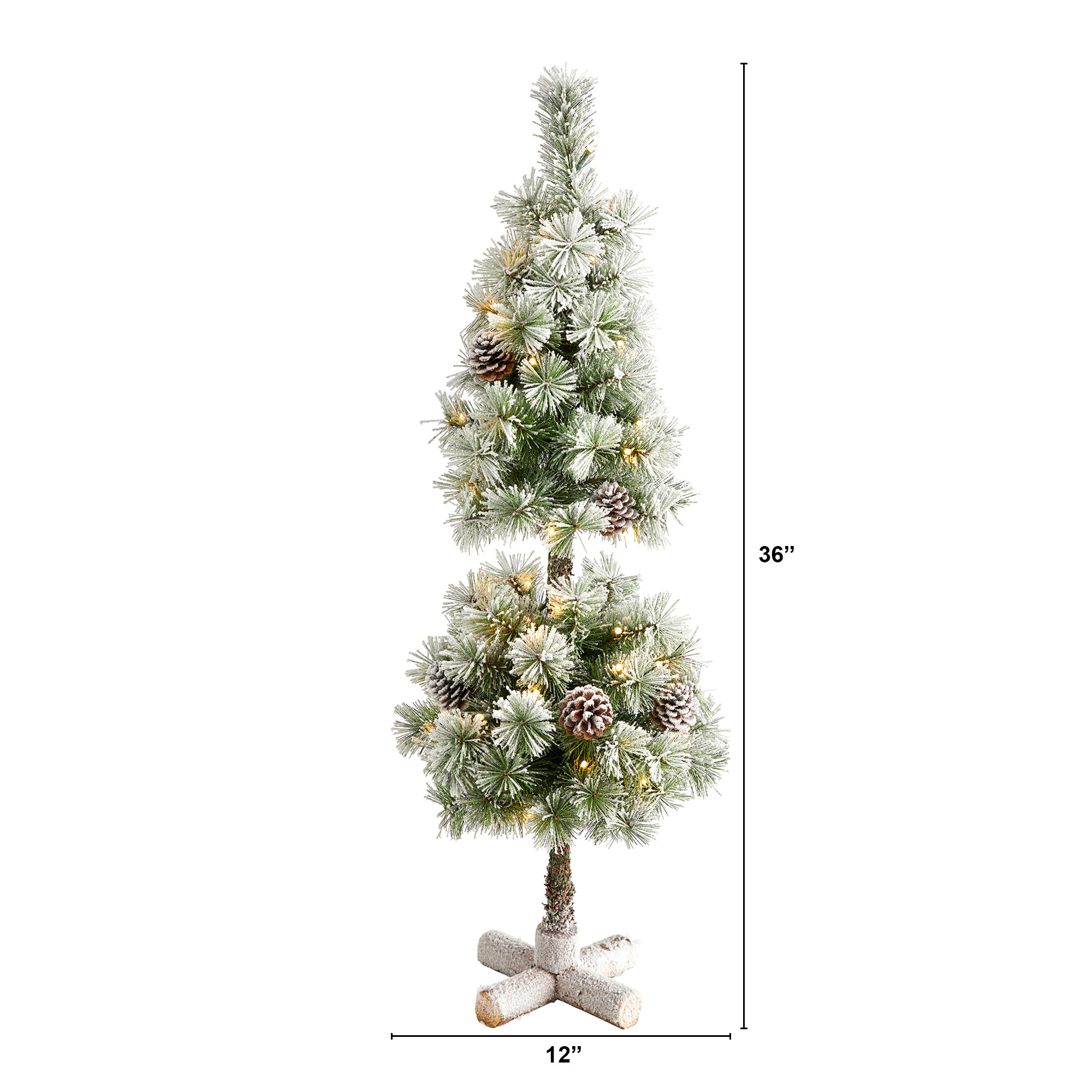 Showcase hints of the season no matter the space restriction with the help of this flocked artificial Christmas tree. Easy to set up and entirely maintenance-free, this miniature faux Christmas tree features a topiary-like design made up of short, bendable branch tips, handsomely accented throughout with miniature faux pinecones and finished with a frosting of faux snow to evoke a winter-inspired setting. Arriving pre-strung with 50 clear LED lights and standing 3' tall carefully stabilized on an accompanying base, this flocked artificial Christmas tree would undoubtedly make a stunning addition to any winter decor scheme.