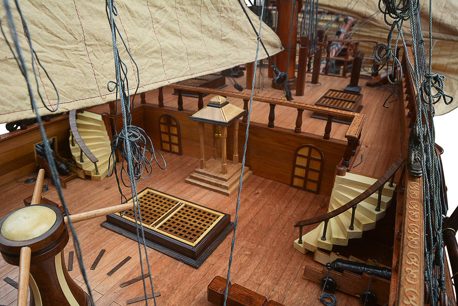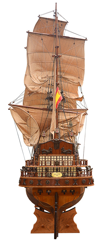 This is a gigantic 13 feet long museum-quality replica of San Felipe, one of the most beautiful Spanish galleons of the XVII century. This is a limited and exclusive edition. The first one was built for a museum in Europe. Master craftsmen using historical photographs, drawings or original plans meticulously handcraft this highly detailed model from scratch. It was built to scale with high-grade wood such as western red cedar, rosewood, and mahogany. It is 100% hand-built using plank-on-frame construction method and is similar to the building of the actual ship. The model requires thousands of hours to finish and went through a demanding quality control process before leaving the workshop. This massive San Felipe XXXL model features plank on frame, three decks, and three rows of ferocious cannons on each side of the ship. A unique bowsprit design that consists of brass statues and crafted brass ornaments on the panels. The front bowsprit and three large masts are connected securely using advanced rigging and lines painstakingly knotted and fastened by hand. Each yard has an attached hand-stitched rolled-up sail made of fine linen. Metal anchors and a wooden rudder are visible on the front and rear of the ship. On the deck, there are metal stationed cannons, authentic hand-built lifeboats with ribs and planks, wooden cabin, and many other handcrafted ornaments. There is also an exquisite detailed admiral’s quarter on the stern with a beautifully handcrafted metal lantern, amazing metal crafted statues, and many other spectacular brass ornaments. This model comes with a solid wood base and brass nameplate. It’ll make an incredible display in your home or organization. Important