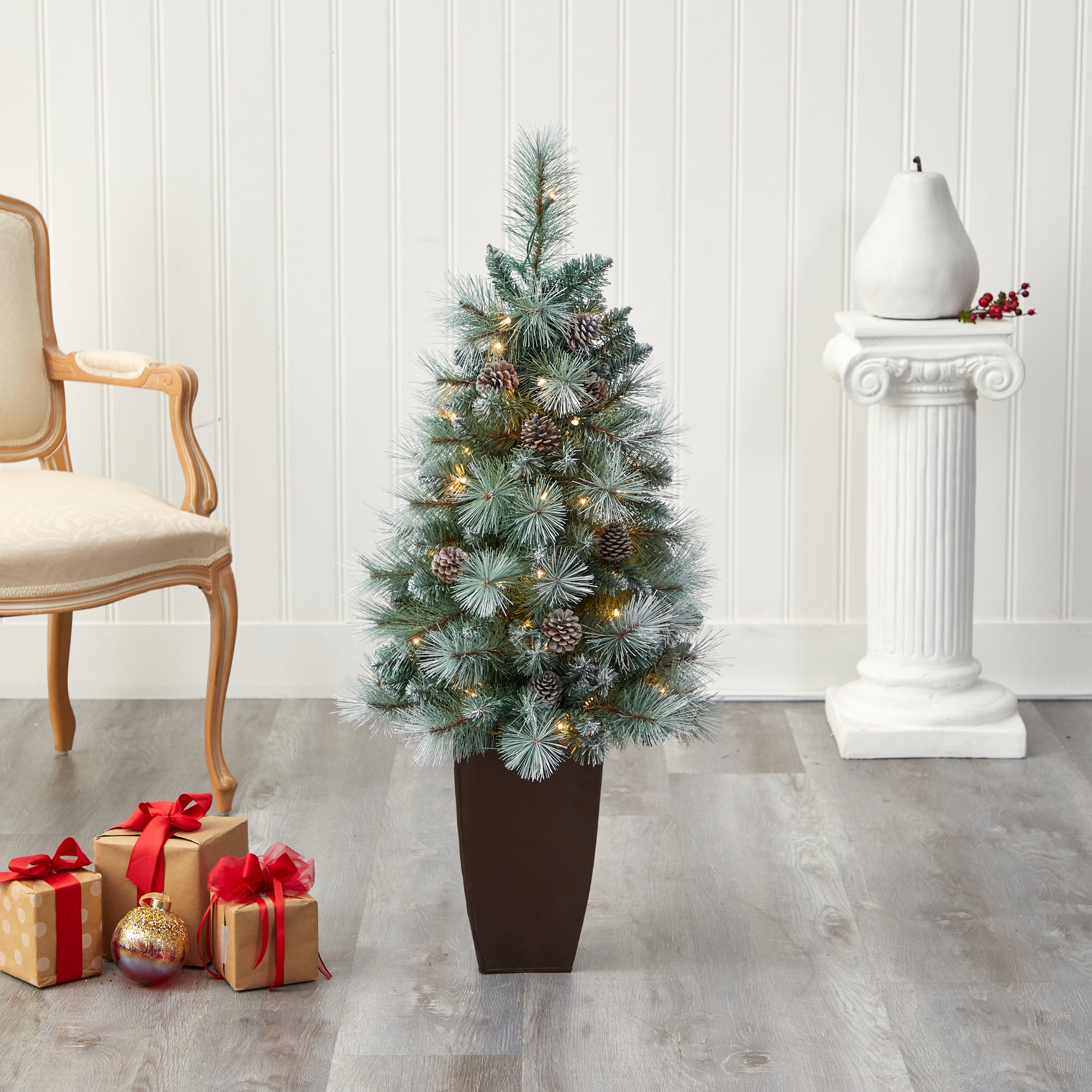 3.5' Frosted Tip British Columbia Mountain Pine Artificial Christmas Tree with 50 Clear Lights, Pine Cones and 112 Bendable Branches in Metal Planter