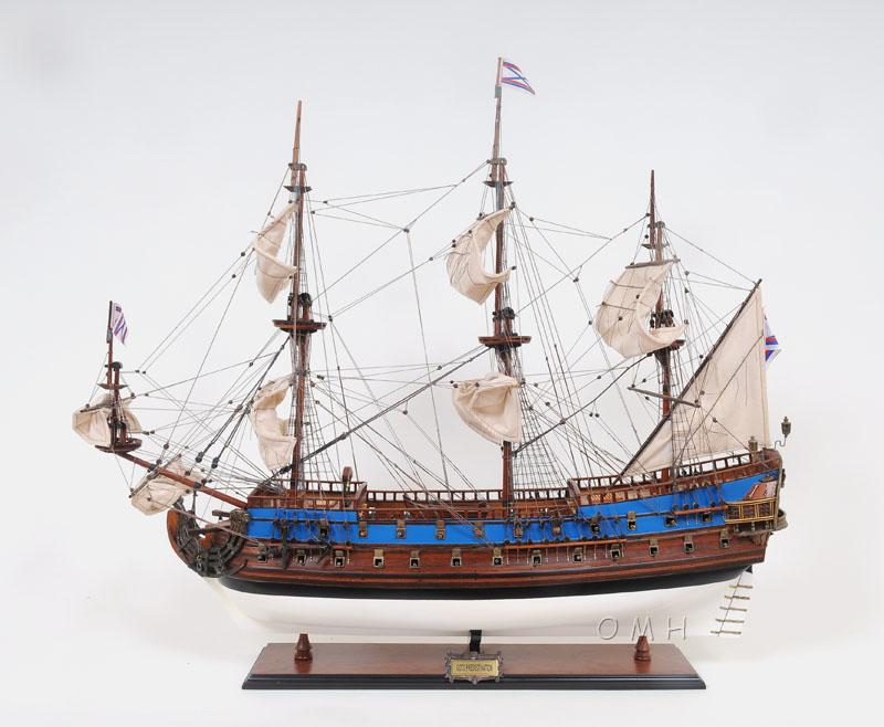 This is a special FULLY ASSEMBLED replica of Goto Predestination (Gods Predestination, literally The Providence of God). It was the Russian 18th century navy flagship, 58-gun and three-masted battleship. Master craftsmen using historical photographs, drawings or original plans meticulously handcraft these highly detailed wood models from scratch. They are built to scale with high-grade wood such as: western red cedar, rosewood, and mahogany. They are 100% hand built individually using plank-on-frame construction method and are similar to the building of actual ships. Each model requires hundreds of hours to finish and must go through a demanding quality control process before leaving the workshop. This beautiful Goto Predestination model has black, blue, and creamy off-white colors painted on the sides of the hull. It features plank on frame, three decks, and two rows of ferocious metal cannons on each side of the ship. The front bowsprit and three large masts are connected securely using advanced rigging and lines painstakingly knotted and fastened by hand. Each yard has an attached hand-stitched rolled-up sails made of fine linen. Metal anchors and a wooden rudder are visible on the front and rear of the ship. On the deck, there are metal stationed cannons, authentic hand-built lifeboats with ribs and planks, wooden cabin, wooden bell tower, wooden windlass, and many other spectacular ornaments. There is also an exquisite detailed admiral’s quarter on the stern with beautiful handcrafted metal lantern, statues of dolphins and its riders, and other unique embellishments. This model comes standard with a solid wood base and brass nameplate. It’ll make a perfect gift for home or office decorator, boat enthusiast or passionate collector.