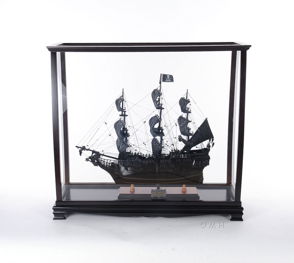 Are you looking for a perfect display combination? Our Black Pearl Pirate Ship 28” model and display case combo will sure to set your home or office apart! The Model: A great item for the Pirate of the Caribbean movie fans! This is an outstanding FULLY ASSEMBLED wood model of the Black Pearl; originally Wicked Wench is Captain Jack Sparrow’s pirate ship. In the three movies (Curse of the Black Pearl, Dead Mans Chest, and At Worlds End) she either overtakes or flees all other ships, including the Interceptor (regarded as the fastest ship in the Caribbean) and the Flying Dutchman (which is actually faster against the wind). Her speed is derived from the large number of sails she carries. She is noted in At Worlds End as being "The only ship as what (which) can outrun the Flying Dutchman." This infamous Black Pearl model is fully coated in dark black paint. It features plank on frame, three decks, and one row of ferocious metal cannons on each side of the ship. The front bowsprit and three large masts are connected securely using advanced rigging and lines painstakingly knotted and fastened by hand. Each yard has an attached hand-stitched unfurled sails made of fine linen. High above the foremast is a distinctive pirate flag with symbols of a skull and two blades crossing each other. Metal anchors and a wooden rudder are visible on the front and rear of the ship. On the deck, there are metal stationed cannons, wooden cabin, wooden stairways, wooden barrels, and many other spectacular ornaments. There is also an exquisite detailed admiral’s quarter on the stern with beautifully handcrafted metal lanterns, uniquely designed portholes, and other unique embellishments. This is an “Exclusive Edition” where the model has a unique serial number etched into the hull, which allows us to identify production date, the material used and all other production information of a model. This model comes standard with a solid wood base and brass nameplate. It’ll make a perfect gift for home or office decorator, boat enthusiast or passionate collector. The Display Case: This beautiful tabletop display case was made out of hardwood and painted in dark mahogany color. It has distinctive designs that add elegance and beauty when displayed in your home or office. It is 100% fully assembled and comes with plexiglass panels on all sides. It features the curves on the sides of the case which enable it to accommodate models with wide yards. This case is very effective when it comes to preventing dust particles as well as keeping your valuable tall ship looking new and protected at all time. It is a must-have for model ship enthusiasts or passionate collectors. Purchase this combo and save now on both item and shipping cost. Notes: Both items will be shipped safely via FedEx Ground. Video instruction on how to put the model into the display case is available via YouTube.