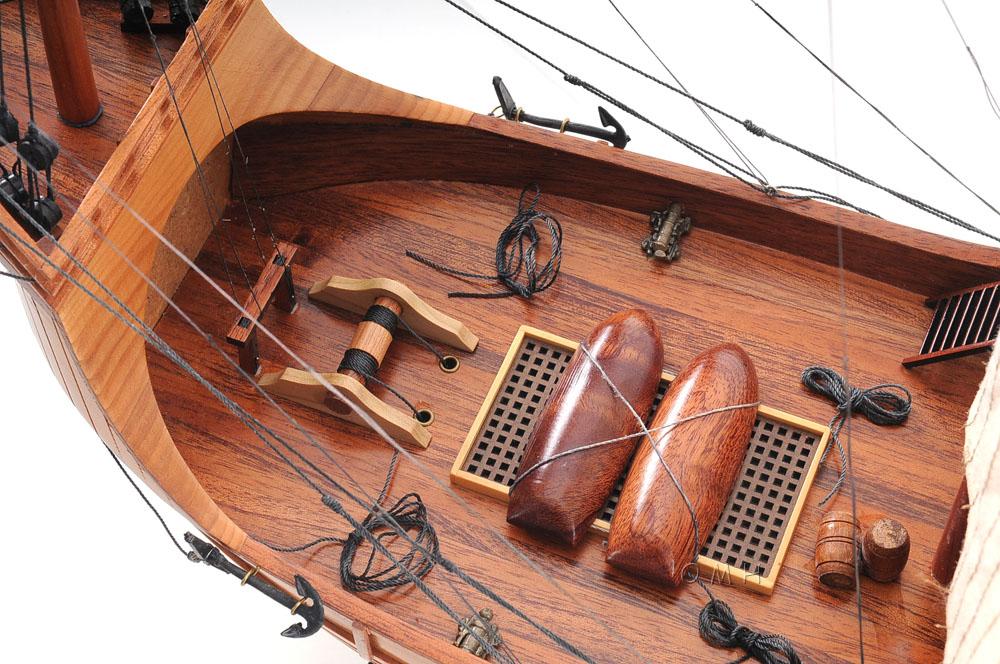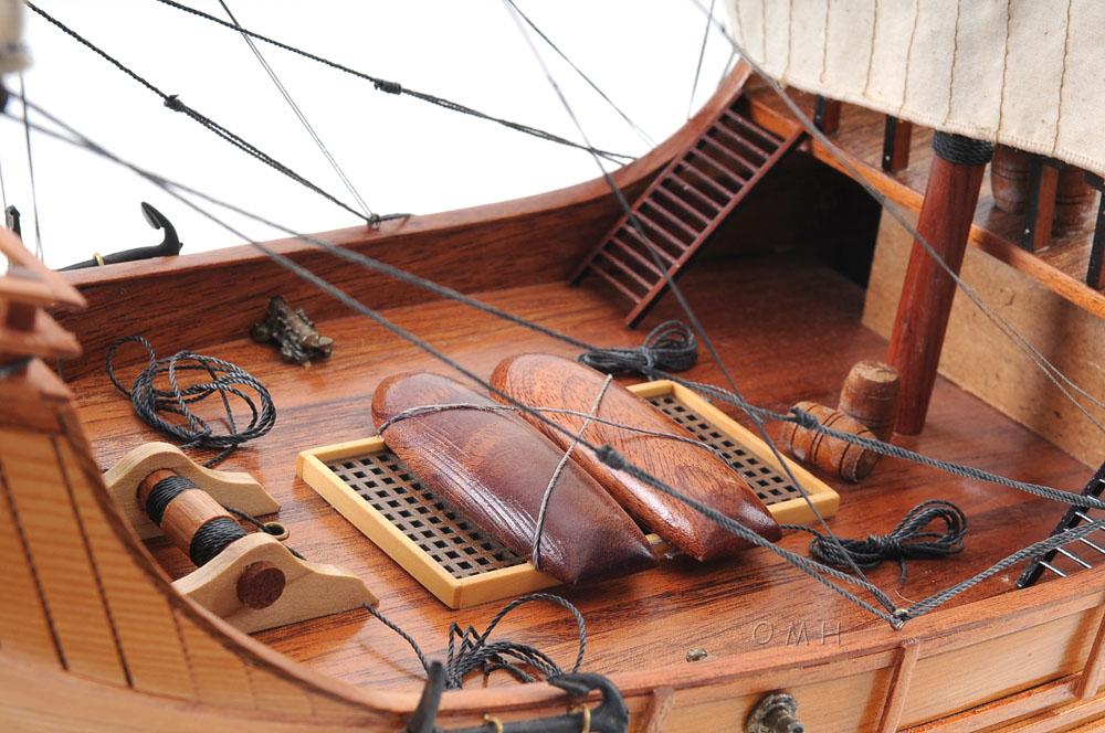 Santa María, original name Marigalante, Christopher Columbus’ flagship on his first voyage to America. Today you can own this unique model fully assembled in your own home or office! The Santa Maria is made out of wood with no plastic pieces. It features plank on frame construction. The front bowsprit and three masts are connected securely using advanced rigging and lines painstakingly knotted and fastened by hand. Each yard has an attached hand-stitched unfurled sails made of fine linen. Metal ornaments, cannon, and wooden lifeboats are visible on this model. It comes with a stand and ready for display.