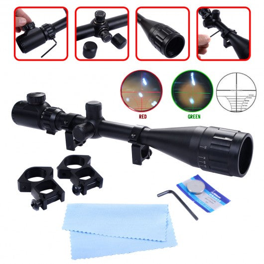 This hunting rifle scope which is perfect for long range shooting. It features high clarity at 6 - 24 magnification and 50 mm (nearly 1.97") objective diameter. The reticle can be illuminated in red or green and in 5-level brightness intensities. It can completely control every aspect of your scope including windage elevation and focus to make the best of the wide field of view. It is perfect for all terrains and all weather conditions. Welcome! Don't hesitate to buy it! Brand new and high quality 6 - 24 magnification with 50mm objective diameter Illuminated level:5 intensity(red) & 5 intensity(green) Wide field of view with tactical mil-dot reticle Easy grip target-style windage and elevation adjustments Precise and easy to use for tactical environment Precision wind age elevation adjustments Anti-glare reflective coating on front lens Can be coupled with air gun and hunting rifle Perfect for all terrains and all weather conditions Spare battery and protective lens covers are included Free 11mm rail mounts only