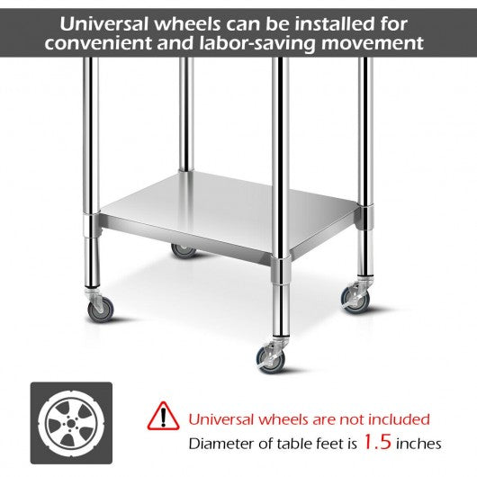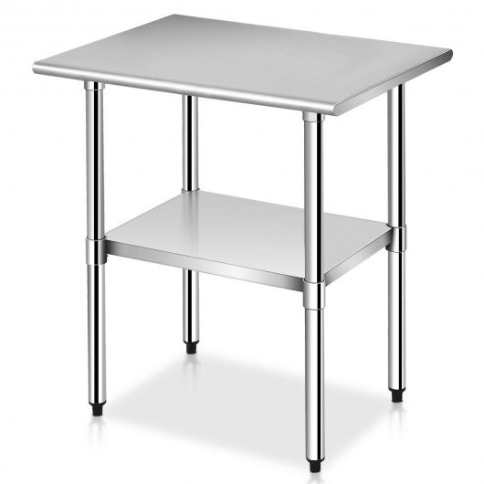 This stainless steel work table is the perfect prep table for use in any kitchen bar restaurant laundry janitorial room cafeteria garage or other commercial setting. The galvanized iron legs and bracing add additional support and durability. It is very easy to clean. With the additional bottom shelf you can keep you supplies organized. The height of the bottom shelf is adjustable which can meet your different needs. With an additional bottom shelf it offers more storage space. It is also easy to clean and bring you superior working comfort. It is suitable for home or business applications. Don't hesitate to bring it home! Brand new and high quality 24" x 30" stainless steel work prep table An additional bottom shelf offering more storage space The height of the bottom shelf is adjustable Built for high-volume use to last a lifetime Galvanized legs and workstation sturdy and durable Easy to clean and superior working comfort Suitable for home or business applications