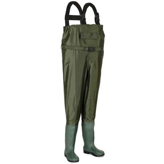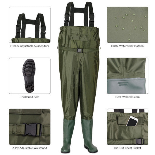 This chest wader is made of 70D waterproof nylon with built-in PVC cover which is wear-resistant tear-resistant not leaking and easy to clean. PVC boots are lightweight and make sure your feet stay warm and dry. H-back adjustable suspenders with durable quick release buckles high quality 2-ply waist belt and flip-out chest pocket provide you more convenience. This chest wader is ideal for fishing hunting farming work or any messy situation. If you are looking for such a chest wader please don't hesitate to buy one! Keep you dry and warm on your fishing adventures hunting farming work or any messy situation 70D nylon with built-in PVC cover waterproof PVC boots with thickened sole and heat welded seams guarantee 100% waterproof reliability Lighter than traditional rubber waders Fit into any backpack and easy to carry 70D waterproof nylon is wear-resistant tear resistant not leaking and easy to clean PVC boot is more durable and will service you for a long time H-back adjustable suspenders with durable quick release buckles High quality 2-ply waist belt Flip-out chest pocket Different sizes can be chosen