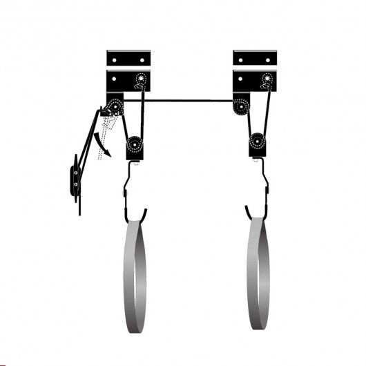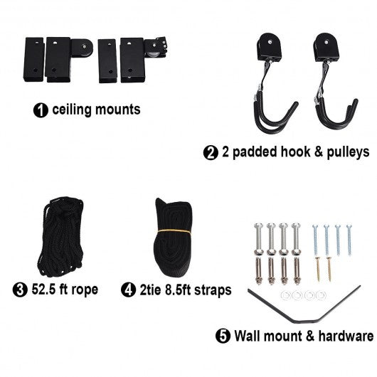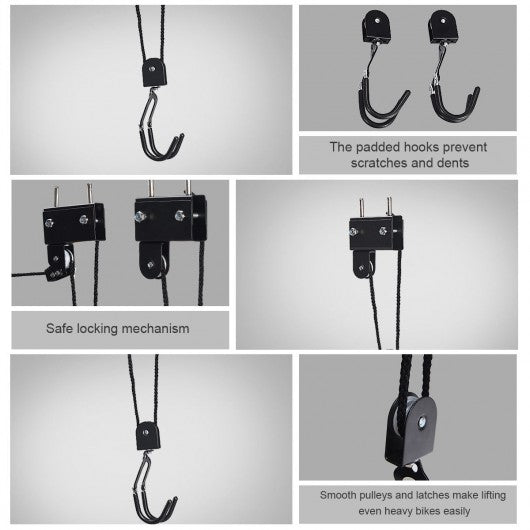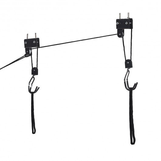 This heavy-duty bike lift allows you to take advantage of unused ceiling space to store your bikes or other appropriate sundries. Are you still concern that your bike is taking up too much space in your house? Installation takes only a matter of minutes and with its ingenious pulley system raising and lowering your bike couldn't be easier. The lift lets you free up precious storage space on the floor plus the improved strong straps eliminate the fragile hooks that are used in cheaper hoists allowing you to lift heavy items up to 100 lb. Just attach lift and lock. Keeping your bike stored away safely while saving additional space has never been easier! If you are looking for heavy-duty bike lift don't hesitate to buy one. Brand-new and high-quality product. Bike-lift ceiling mounts perfect for ceilings up to 10 ft high. Pulley system easily hoists bikes up to 100 lbs. to the ceiling; secure locking mechanism. Solid steel construction nylon rope. Hooks are designed with a plastic coating to protect your bicycle from getting scratched or damaged. The improved strong straps eliminate the fragile hooks that are used in cheaper hoists. Smooth pulleys and latches make lifting even the heavier bikes convenient and easy.