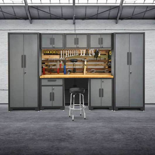 The 8-piece cabinets set provides a perfect solution for your garage storage. It includes 2 multi-use lockers 3 wall cabinets 1 two-door base cabinet 1 one-drawer two-door cabinet 1 bamboo worktop. All cabinets are fully lockable that you needn't worry about your tools being stolen ensuring your tools stay safe. And these cabinets are made of high-quality 24-gauge steel durable and strong enough to store many different kinds of things. The bamboo worktop allows you to make repairs or perform some projects on it. Equipped with adjustable feet you could keep your cabinet stable on an uneven floor. The adjustable shelves can also maximize your storage needs. What's more these cabinets can be used alone and combined freely. Don't hesitate to buy it! Made of high-quality 24-gauge steel durable to last a long time New and popular 8-pieces design the best choice for your garage and workshop Lockable design for maximum security One bamboo worktop for higher hardness and damp proof Flexible combination each cabinet can be used independently Adjustable feet to keep stable on uneven floor Adjustable and detachable shelves meet you different storage needs Easy-to-grab handles for easy open and closes the door Drawer with slide rails can save your energy when pulling the drawer Mount type: freestanding/wall mounted Easy to clean and easy to assemble