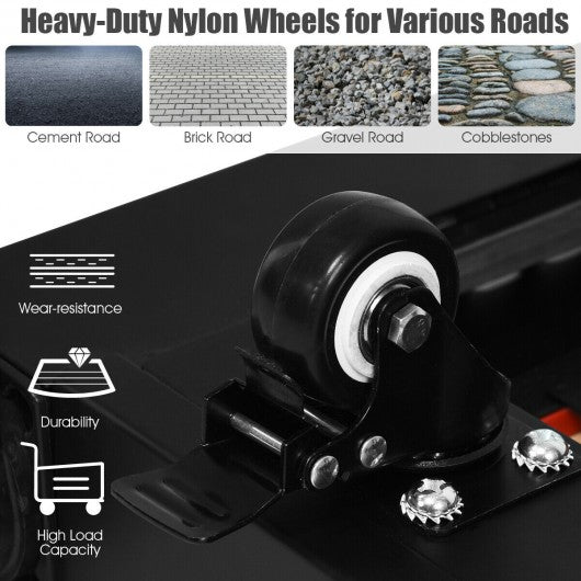 This 5 in 1 multi-function workbench can be used as a workbench scaffold mobile cart dolly or hand truck to meet different needs and it has a high load-bearing capacity to use safely. When you convert it to a mobile cart or push-pull cart you need to install 4 heavy wheels including 2 universal wheels and 2 fixed wheels to slide smoothly on the ground when it is used as a workbench or scaffold mode each leg has a non-slip mat at the bottom to add extra stability. At the same time the worktop has precise scales and protractors for easy operation and its foldable and portable features make it easy to store and transport. If you are looking for a multi-function workbench don't hesitate to buy it! 5-in-1 multi-function workbench: workbench scaffold mobile cart dolly and hand truck Utility tray on the tabletop can keep extra tools and accessories in your reach MDF board is more eco-friendly and durable High-strength iron and aluminum frame is super sturdy Scale and protractor on the countertop for precise work 4 heavy-duty wheels to move smoothly Non-slip pads add an extra stability Folded design to placed anywhere in the corner Portable design makes it easy to carry