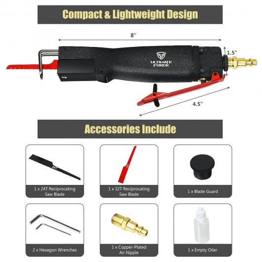 Specification: Color: Black Material: Aluminum alloy Total length(without blade): 8" Strokes per minute: 9000 Air pressure: 90 PSI Air consumption: 3.0 scfm Saw stroke:10 mm Air inlet:1/4" Noise Level(dBA): 96 Net weight: 1.5 lbs Package included: 1 x Air saw 1 x 24T reciprocating saw blade 1 x 32T reciprocating saw blade 1 x Blade guard 2 x Hexagon wrenches 1 x Copper-plated air nipple 1 x Empty oiler