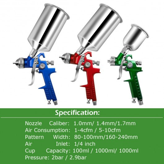 Specification: Material: aluminum Nozzle caliber: 1.0 mm(green) 1.7 mm(red) 1.4 mm(blue) Air inlet: 1/4" NPT