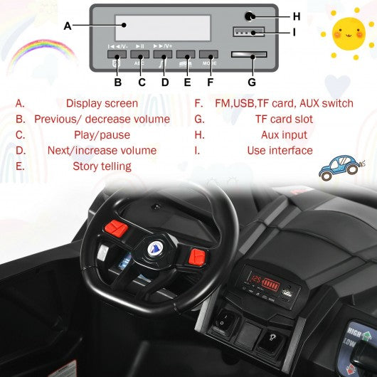 Watch the smile beaming on your kids' faces while you hand over our ride-on off-road truck to them. Offer your kids realistic driving on a mini UTV car with multiple media functions. This double-door car has back trunk storage horn and lights on the head and tail. What make driving more fun are the built-in music FM and story functions. You can even link the car with your smart device through TF AUX and USB. The 2.4G remote gives parents assurance of safety and control priority and has 3 speeds and a brake button. Steering wheel and foot pedal (2 speeds) can also move the car by kids themselves to explore the fun of taking control and driving. And there are 2 seats for 2 little racers to share the fun with a safety belt to make sure the drive is safe.It is suitable for 3-years-old and elders. If you are looking for a mini UTV car like this do not hesitate to place an order! A mini version truck of many realistic functions: opening doors storage trunk lights horns Lockable doors and seat belt for safety Parental remote control and steering wheel and foot accelerate control 3 speeds in remote and 2 speeds in manual Spring suspension wheels to absorb shock and vibration Slow start system for a smooth and safe drive Wheels can roll on concrete asphalt wood road pavements and more Music story FM TF and USB and AUX socket reverse and forward stick lighting dashboards Power can be indicated on the screen The seat is suitable for riding 2 kids within 110 lbs loading limitation An ideal gift designed for kids of 3 + A convenient handle to move the car when the power is dead