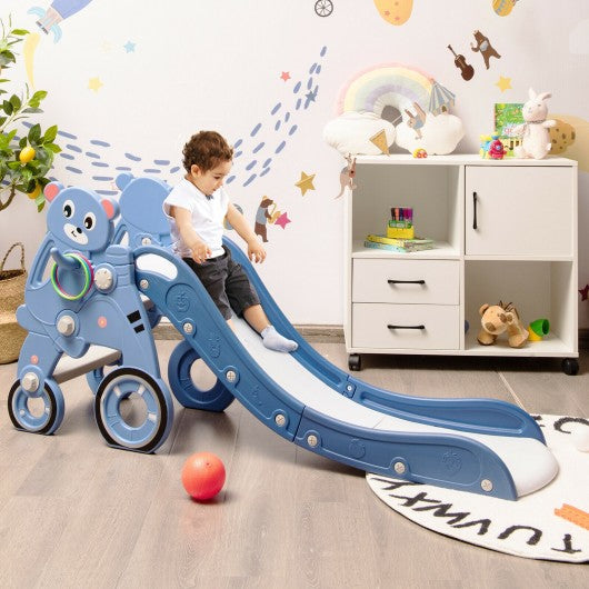 Do you want to give your kids playing while developing adventure spirit space in your home? These kids slide with a max load-bearing capacity of 110 lbs is the perfect choice for your kids aged 1-6 years old accompanying their childhood! With a cute cartoon shape this slide would be popular in the kids' age group attracting much of their attention playing. The extra-long slide enhances the cushioning force during the sliding process preventing the baby from sliding out of the slide and getting injured. As a multifunctional slide set our kid slide is equipped with a basketball hoop telescope ring toss steering wheel and so on. Moreovertheseis kids slide set is not only a toy but also a great equipment to exercise kids' physical development abilities and arouse their interests in sports. This will be the slide you can't miss buy it now! The 4-in-1 multi-functional slide is equipped with a climbing ladder slide basketball hoop and ring toss The wide armrest design is easy for children to grasp Made of odorless and non-toxic high-quality PE material certified by ASTM Smooth surface and round edges prevent injuries and scratches The closed climb steps with non-slip texture make it safer and easier for kids to climb Triangular stable structure to ensure safe use Foldable design for easy storage A great gift for kids to play indoors and outdoors Easy to assemble and maintain