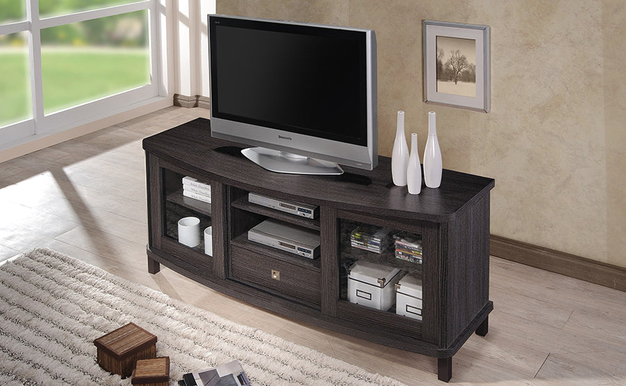 A romantic greyish dark brown embossed finish covers the bowed case of this television stand. Constructed with your needs in mind, the Walda 60-inch TV cabinet features ample storage to keep your living room organized and free of mess! Two glass sliding doors open to media shelves for easy storage and use of media players, gaming consoles, and more. Outer shelves are great for books, DVDs, or decorative touches. Two drawers are perfect for hiding remotes, controllers, coasters, and cards. Coupling storage and sleek design, this unit is perfect for your functional modern home. The TV stand is made of engineered wood that is practical for everyday use. Made in Malaysia, it requires assembly with all of the hardware's provided.