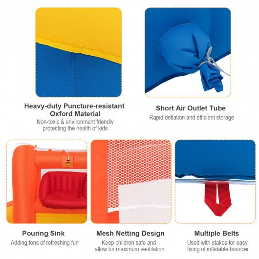 This is the inflatable heavy duty water bouncer which is extraordinarily durable to have a good time for your children. Made of heavy-duty puncture proof 420 D oxford materials it owns a curved water slide a rock climbing wall and a spacious splash pool with a water cannon which provides safe and versatile game when your kids slide and climb. The popular water castle is an ideal play center for parks backyards and more. What a great present for your little prince or princess to enjoy summer days. Your kids will love all the actions while you will love the quality durability and safety. If you are looking for such product don't hesitate to buy it now! 420 D oxford material and wear-resistant surfaces Protective netting and raised wall protecting your kids sliding out Three sprayers splashing together adding more fun A curved slide constructed by 800 D oxford for long life span Challenging climbing wall for you children to build up courage Water cannon for a fun ride into the refreshing pool Easy to setup and take down (suggested 680 W blower not included) A repairing kit providing additional stability for emergent scratching With a carrying bag folds compactly for easy storage convenient to take it anywhere Stay cool all day continuously spraying when it connected to a tap