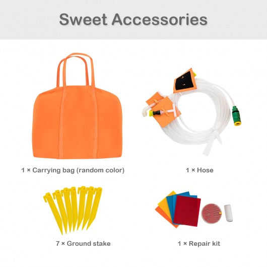 Specification: Material: Oxford cloth PVC plastic Inflated size: 126.5" x 106.5" x 82.5" (L x W x H) Recommended age: 3-7 years old Product net weight: 16.5 lbs Maximum weight capacity: 150 lbs (Suggestion: Every kid's weight should be under 50lbs) Suitable for 2-3 kids play together Blower: Suggested 680 W (not included) Recommand blower: 950W Blower Package includes: 1 x Inflatable water slide 1 x Repair kit 7 x Ground stake 1 x Carrying bag (random color) 1 x Water hose 1 x Instruction