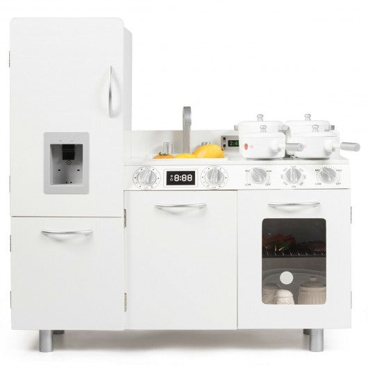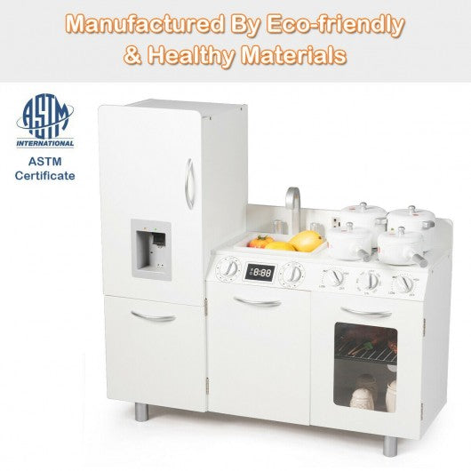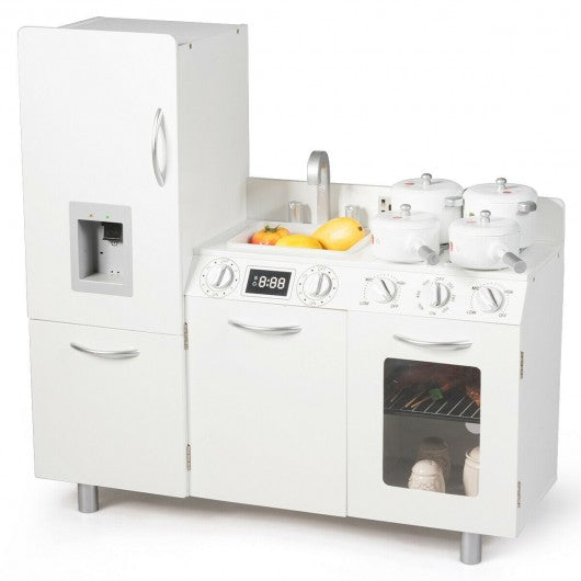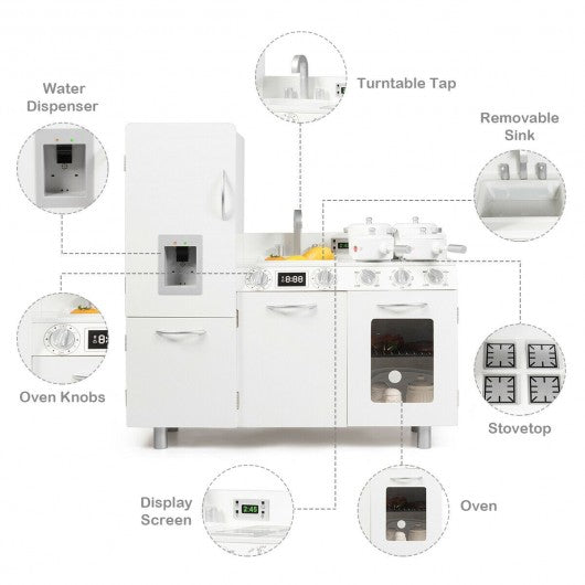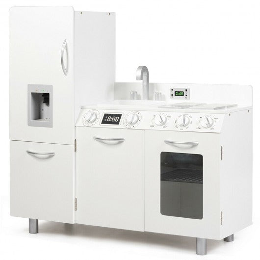 This is the new kids' kitchen playset which provides a realistic cooking experience with some innovative features for your children. This cooking set includes refrigerator sink stove water dispenser baking oven and other kitchen essentials. The water dispenser will give out clear sound of flowing water under continuous pressing to provide the realistic cooking experience. We guarantee all construction materials are healthy and eco-friendly and reach ASTM standard. Durable wood with smooth veneer makes easy cleaning just with a damp cloth. Besides our detailed instruction allows you to assemble it effortlessly. With this kitchen cooking collocation recognition manipulative ability and creativity beyond imagination will be developed and the relationship between kids with his parents and friends can be enhanced If you are looking for such a toy for your children don't hesitate to buy one. Made of durable wood with smooth veneer sturdy & easy to clean Eco-friendly & safe materials have passed ASTM certification To help kids� collocation recognition manipulative ability & imagination Roomy storage space enclosed cabinets to help countertop tidy & organized Removable sink with turnable tap easy for kid to clear out little dirt Emulation display screen for reminding children of cook time Complete realistic cooking set refrigerator sink stove water dispenser. Breathable holes at the back protect children from being suffocated Explicit installation guide & complete hardware helping you easily assemble the set Perfect educational gift for children in Christmas or on birthdays