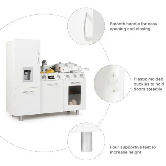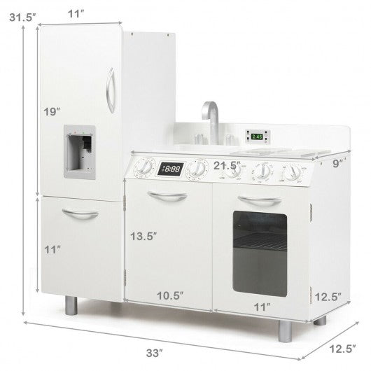 Specification: Color: White Main material: P2 MDF Product dimension: 33" x 12.5" x 31.5" ( L x W x H ) Net weight: 29 lbs Suitable for kids: Over 3 years old Package includes: 1 x Kitchen playset 1 x Instruction
