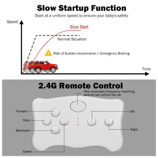 This ride on car comes with shining lights built-in music mode and horn sound which will attract your children and bring them joy! This toy car is a small version of Mercedes-Benz GLE63S. Kid can drive this car by himself/herself or parents can help operate the car through 2.4 G remote control to enhance parent-child relationship. Spacious seat openable doors forward/ reverse button horn and steering wheel will give them wonderful and exciting driving experience. With slow startup design shock proof wheels and belt your little one will get the best protection. Kids can press the button to switch and listen various songs doubling their enjoyment. Don't hesitate to buy it! 12 V Mercedes-Benz GLE63S with specialized luxury appearance One-button assembly wheel design facilitates installation 2 powerful drive motors to reach 2.5-3 km/h speed Equipped with AUX input USB port and TF card slot to connect external devices 2.4 G parental remote control mode (3 adjustable speeds) & battery operate mode (fast / slow speeds) Slow start function for gradual acceleration and reliable braking Spacious seat with safety belt for sitting and playing Bright LED lights built-in music mode and horn sound to attract baby 4 explosion-proof wheels with spring suspension for long-time use Forward & reverse button and steering wheel for kids to operate easily Doors can be opened for add fun and convenience Equipped with foldable handle for easy transportation One-button start design for enough convenience Has passed CEC DOE and ASTM certification for safe use