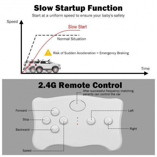 This ride on car comes with shining lights built-in music mode and horn sound which will attract your children and bring them joy! This toy car is a small version of Mercedes-Benz GLE63S. Kid can drive this car by himself/herself or parents can help operate the car through 2.4 G remote control to enhance parent-child relationship. Spacious seat openable doors forward/ reverse button horn and steering wheel will give them wonderful and exciting driving experience. With slow startup design shock proof wheels and belt your little one will get the best protection. Kids can press the button to switch and listen various songs doubling their enjoyment. Don't hesitate to buy it! 12 V Mercedes-Benz GLE63S with specialized luxury appearance One-button assembly wheel design facilitates installation 2 powerful drive motors to reach 2.5-3 km/h speed Equipped with AUX input USB port and TF card slot to connect external devices 2.4 G parental remote control mode (3 adjustable speeds) & battery operate mode (fast / slow speeds) Slow start function for gradual acceleration and reliable braking Spacious seat with safety belt for sitting and playing Bright LED lights built-in music mode and horn sound to attract baby 4 explosion-proof wheels with spring suspension for long-time use Forward & reverse button and steering wheel for kids to operate easily Doors can be opened for add fun and convenience Equipped with foldable handle for easy transportation One-button start design for enough convenience Has passed CEC DOE and ASTM certification for safe use