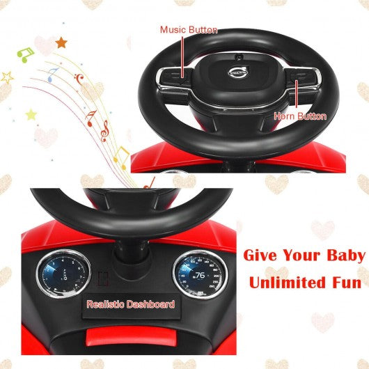 With cool appearance attractive sounds and ergonomic design this ride-on toy is an ideal gift for your child! Your little angel can slide the car by himself/ herself or use it as a push toy with a kid-sized handle. Safe materials wear-resistant wheels and anti-fall board are protective enough to enhance kids' safety during riding. If kids want to carry some small toys snacks or other items the hidden storage room under the seat will satisfy their requirement perfectly. Comfortable wide seat and steering wheel with built-in music and horn sound will give them wonderful and exciting driving experience. Kids-friendly PP material and metal frame to ensure sturdiness and durability Multifunctional steering wheel with music and horn button Effectively protects kids from falling backward with anti-roll board Spacious storage space under the seat to store toys snacks etc Ergonomic seat for comfortable riding experience 4 wear-resistant wheels for a variety of flat roads Backrest to use as handle for easy carrying or a kid-sized push bar for pushing car Foot-to-floor design to train child's leg strength Cool appearance to attract baby Max weight capacity can reach 51 lbs Ideal for children aged 37-96 months old