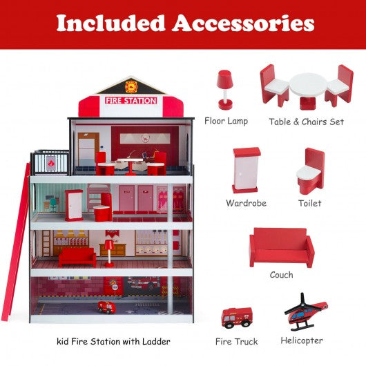 Wooden Fire Station Dollhouse Playset with Truck and Helicopter