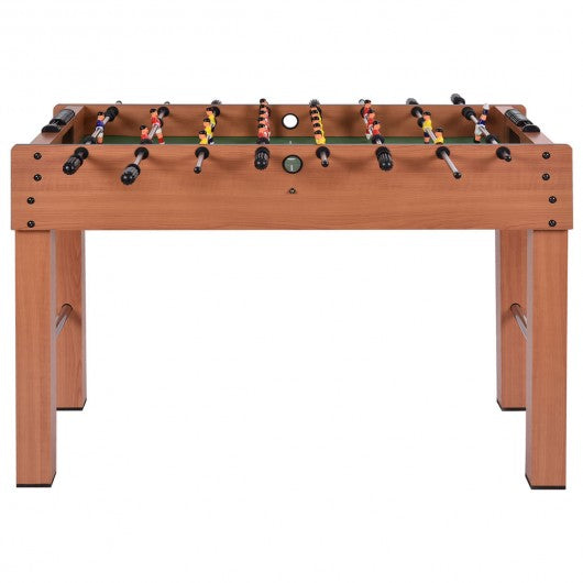 This foosball soccer table is perfect for any indoor amusement between families friends and colleagues. It features a wood construction strong steel rods with slide bearings for smooth rotation and ball serve cups on both sides for convenience. There are fabricated focused of players soccer field and crowd graphics and scoring device on both sides. It has scoring device to count the game process conveniently. High quality with competitive price can be realized here! Brand new and high quality Strong wood construction and solid steel rods 8 rods are included within the table to allow 4 rows per team; 11 red players and 11 yellow players Equipped with ball serve cups for convenience Internal ball retrieval at each goal Plastic manual slide scorers at each goal Unified leg panel design with leg spanners on each side Scoring device to count the game process conveniently Two footballs included Note: 1. Simple assembly is required according to the included instruction. 2. Please make sure all the connections are tightened before using. Please keep the football away with the children under 3 years old.