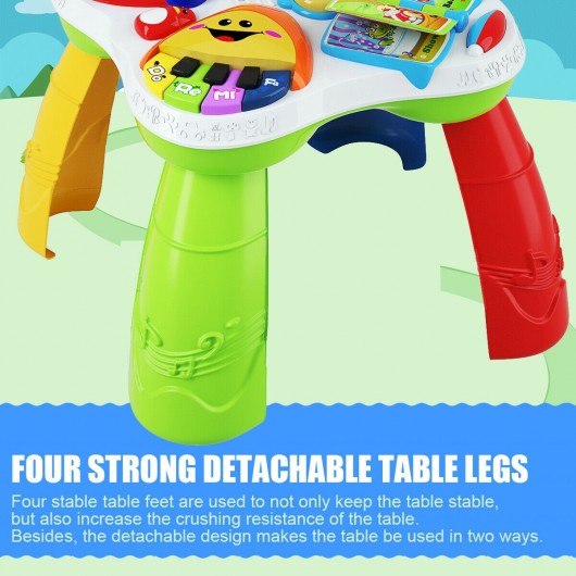 This magical and functional baby learning table is a perfect toy for experience of interactive learning and encouraging your kids to explore and learn. This learning table can play music and has a light function. Made of safe and nontoxic material the activity desk has detachable legs so that your kids can play at any place. It can teach your baby to learn the language numbers colors songs logic etc. Fun colors lively music and sound effects all of these will promote baby's sensory. The abundant learning modes will stimulate curiosity & desire of exploration of your baby. By choosing modes on the table your kids? fingers will be exercised well in this way. The kid?s learning table complies with national safety standards for toys and is suitable for baby under 3. Don?t hesitate to buy it! Brand new and high quality Music lights & sounds Safe and nontoxic material Detachable legs Suitable for babies under 3 years old Featuring four main parts Complies with national safety standards for toys