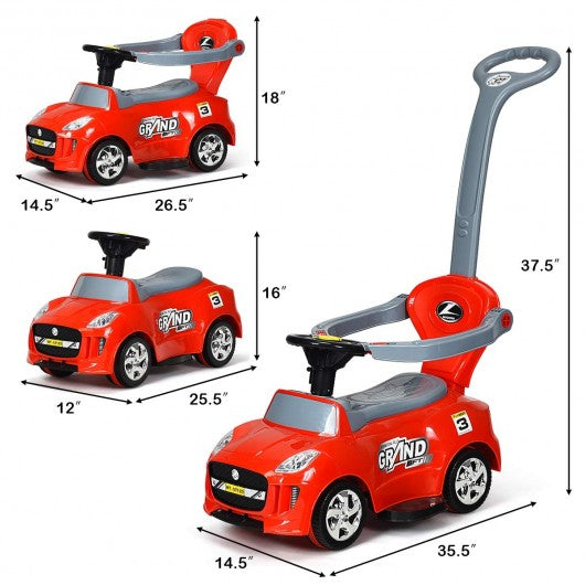 Not Available For Sale Or Use in California This is the 3 in 1 ride on push car which can be used as a stroller a walking car or a ride on car. Featuring bright colors multiple function and simulation design this ride on push car will offer multiple entertainment to children. Dismountable 360°safety guardrail design ensures maximum safety and helps kids stay in position. And when toddlers steps on the ground and slides forward it helps exercise their leg muscles sense of direction hand-eye coordination and motor skills. It is excellent in quality and reasonable in design this ride on toy is worth to buy! 3 in 1 design: Pushing function sliding function and remote control function Dismountable 360° safety guardrail for added security Removable handle rod for effortless pulling and pushing Steering wheel with horn sound and music (40 songs included) Forward & reverse functions working headlights Comfortable backrest serves as walker handle and anti-falling support Fixed anti-falling back brake prevents the car from tilting backward Compartment under the seat to store remote control charger etc Four anti-skid wheels is harmless to floor provide stable structure Made of high-quality and non-toxic PP material With a 2.4 ghz remote control Assembly required