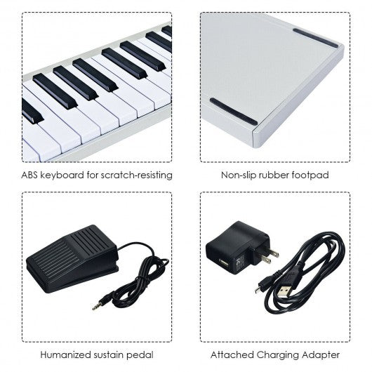 Specification: Color: Black Material: ABS+ PC+ aluminum alloy Product dimensions: 35.8 x 5.9 x 0.9 inches (L x W x H) Product dimensions (including bag): 37 x 7.5 x 1.2 inches (L x W x H) Net weight: 6.6 lbs Input voltage: USB DC5V Input: 100 V / 60 HZ Output: 5 V 1000 mAh Applicable age: Over 6 years old Package includes: 1 x Portable electronic piano 1 x Power supply 1 x USB cable 1 x Sustain pedal 1 x Instruction