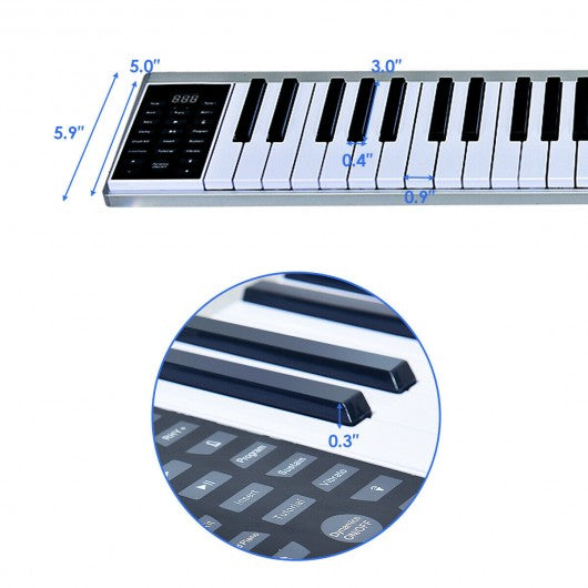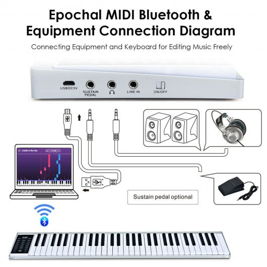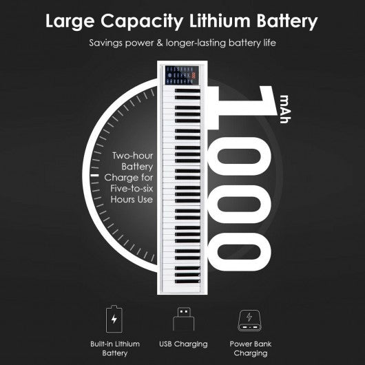 The digital music piano 61-keyboard is the perfect portable piano keyboard for both kids and adults! Constructed of aluminum frame and premium keys this electronic piano is lightweight durable and ensures long-time use. Equipped with a 600D Oxford handbag it can be easily carried anywhere. This electronic piano features 128 timbres 128 rhythms and 14 demonstration songs to practice and perform. The built-in lithium-ion battery can be used for 5-6 hours after charging for 2 hours. Also it can be powered by a USB connection from a computer iPad or iPhone (an OTG cable is needed for connecting to an iPad or an iPhone.) an OTG cable for connecting to iPad or iPhone.) If you are looking for the piano 61-keyboard don't hesitate to buy it! Made of aluminum frame and premium ABS keys provide stability and long-time use. 128 timbres + 128 rhythms + 14 demonstration songs for realistic music performance. It is equipped with an epochal MIDI bluetooth which allows for a Wi-Fi connection thus the ability to play it anywhere. Easy operation control panel with a clear digital display for real-time feedback. The built-in lithium-ion battery can be used for 5-6 hours after charging for 2 hours. It comes with a carrying bag for easy transportation.