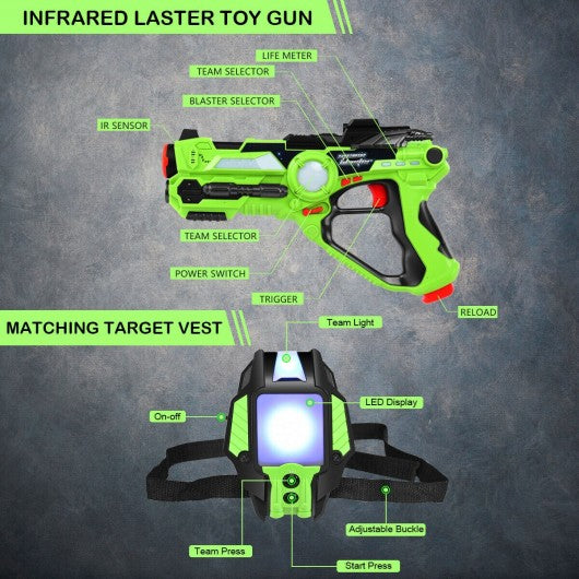 Guns match with vests perfectly to help you identify your teammates or enemies. This is a new set of 4 infrared laser guns and vests providing a realistic styling with some innovative features for your children. Lights sound vibration 4 teams together enjoy realistic feelings on the holidays or snowy days. This laser tag set will help your kid enhance the relationship with his friends. Don't hesitate to buy one set! Infrared laser guns matching vests making your kids cool Premium quality guarantee ensuring you receive a complete & functional set Lights vibration and sound infrared technology are all in guns and vests One gun can be switched between pistol shotgun machine gun and rocket 3 lights(1 light= 3 lives) on the gun indicating how many lives you left for each battle 130ft shooting range 4 different types of ammunition Ergonomically designed guns with solid grips easy to handle String vests on adjustable buckles easy to assemble Best gift for your children and their friends on birthday or Christmas
