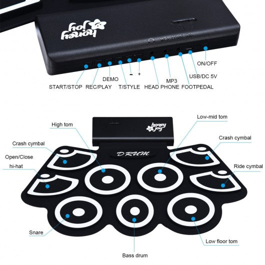 This electronic roll up drum kit is a great value and comes with everything a drummer needs to get started. This roll-up drum kit is composed of drum pads that emit realistic sounds including crash cymbal ride cymbal open/close hi-hat snare bass drum high tom low tom and fool tom. The fascinating set allows musicians to record funky beats and upload them to a computer with the connection. The thick drum pad can easily be rolled up and the portable and lightweight design of the compact kit makes it easy to take anywhere. This all-inclusive drum pad set provides enhanced sound with two pedals one for bass and the other for hi-hat providing more realistic feel than alternatives. These are great for beginners and younger individuals. Don't hesitate to buy it! High quality drum samples a real beat feel Silicon pad can be rolled easily to make carry easier Battery operated charged for 1 hours can be used for 20 hours Drum pads provide realistic expression; similar sounds to a non-electric drum kit 9 drums pads with variety of sounds: crash cymbal ride cymbal open/close hi-hat snare bass drum high tom low tom fool tom 2 drum pedals provide more realistic feel : 1 hi-hat 1 base drum Support to connect a external speaker the sounds will be much shocking Include 4 demo songs 7 drum sounds 9 accompaniment Built-in resonant diaphagm sounds are louder Playing speed of demo and accompaniment adjustable Volume adjustable With recording function get all your inspiration in record easily Audio input and bluetooth function match your mobile phone tablet PC and other device which could support music Could connect with your earphone will not disturb others when you using it A great gift for any budding musician No assembly required