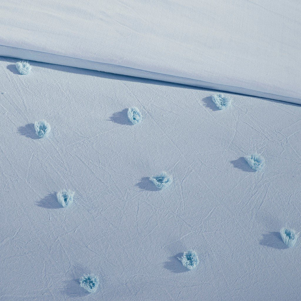 The Urban Habitat Brooklyn 5 Piece Comforter Set will create a charming look to your space. Featuring small cotton tufts, the comforter and matching sham add texture to this solid pale blue bedding set. A solid pale blue reverse complements the top of the bed, while one quilted euro sham adds texture to the bed. Two decorative pillows are also included to complete this comforter set. One pillow features a pleated design, while the other has matching cotton tufts to coordinate with the top of the bed. Made from 100% cotton, this comforter is machine washable and will provide a graceful update to your bedroom decor.