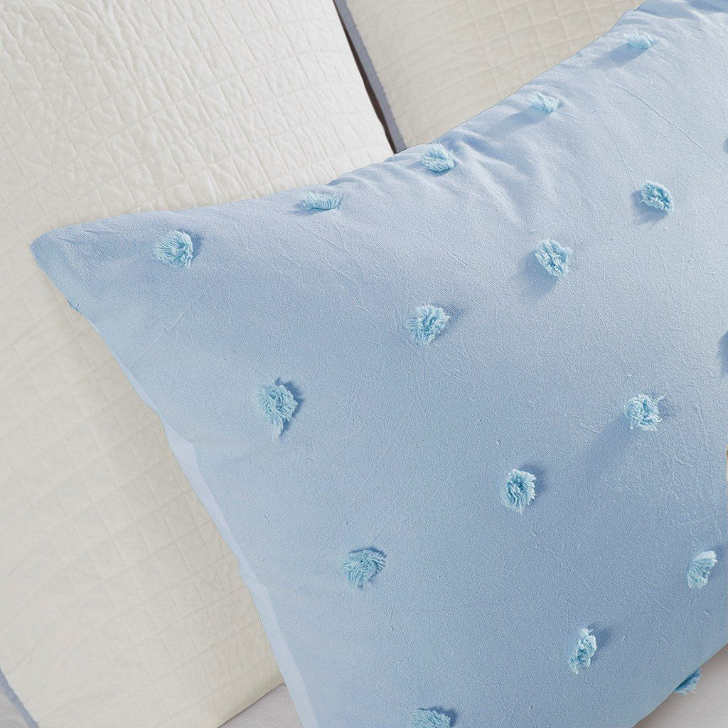The Urban Habitat Brooklyn 7 Piece Comforter Set will create a charming look to your space. Featuring small cotton tufts, the comforter and matching shams add texture to this solid pale blue bedding set. A solid pale blue reverse complements the top of the bed, while quilted euro shams adds texture to the bed. Two decorative pillows are also included to complete this comforter set. One pillow features a pleated design, while the other has matching cotton tufts to coordinate with the top of the bed. Made from 100% cotton, this comforter is machine washable and will provide a graceful update to your bedroom decor.