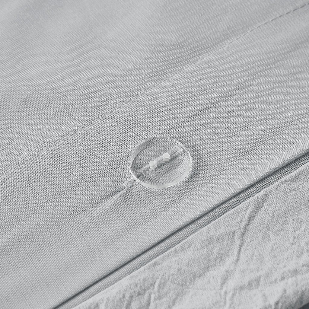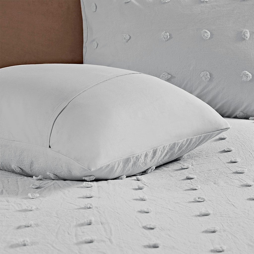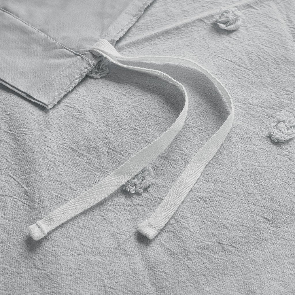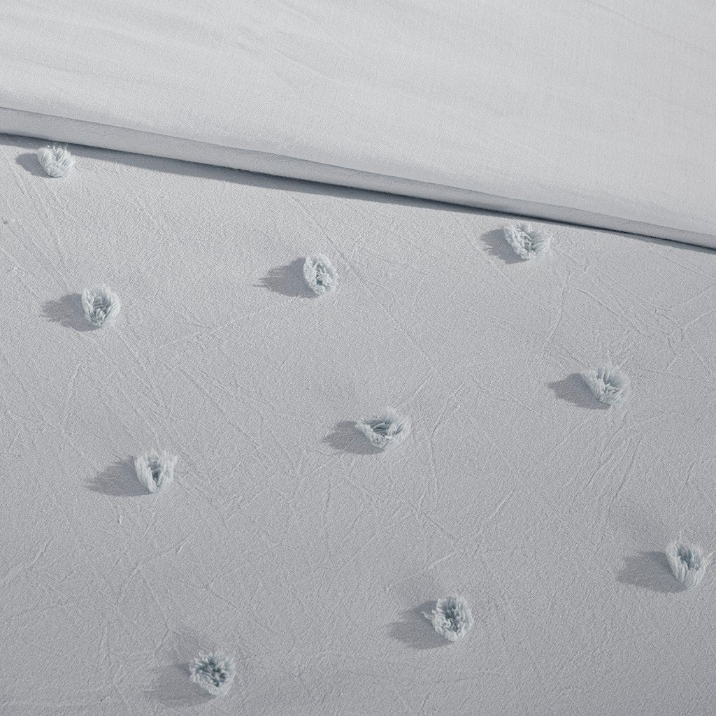The Urban Habitat Brooklyn 7 Piece Duvet Cover Set will create a charming look to your space. Featuring small cotton tufts, the duvet cover and matching shams add texture to this solid soft grey bedding set. A solid pale blue reverse complements the top of the bed, while quilted euro shams adds texture to the bed. Two decorative pillows are also included to complete this duvet cover set. One pillow features a pleated design, while the other has matching cotton tufts to coordinate with the top of the bed. Made from 100% cotton, this duvet cover is machine washable and will provide a graceful update to your bedroom decor. Button closures allow you to place a comforter insert within the duvet cover and the hidden internal corner ties prevent it from shifting.