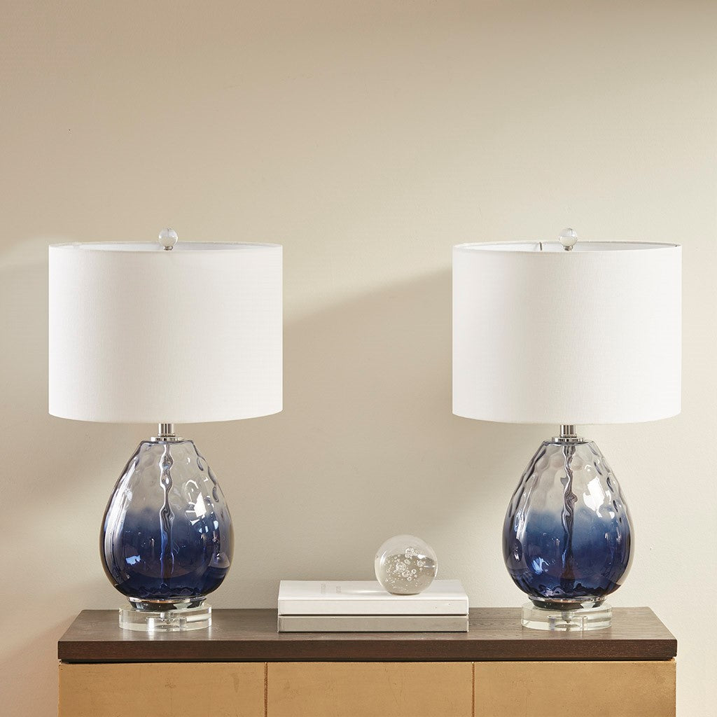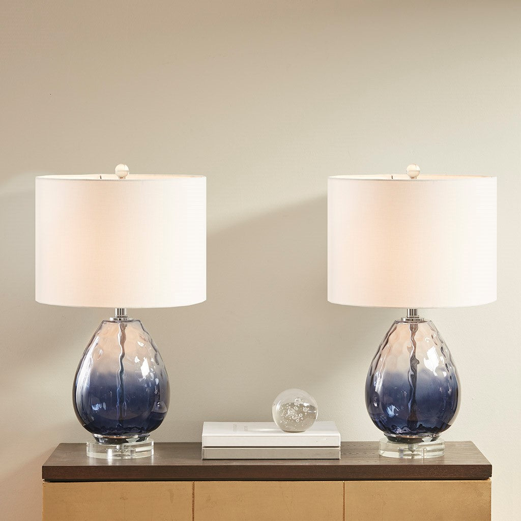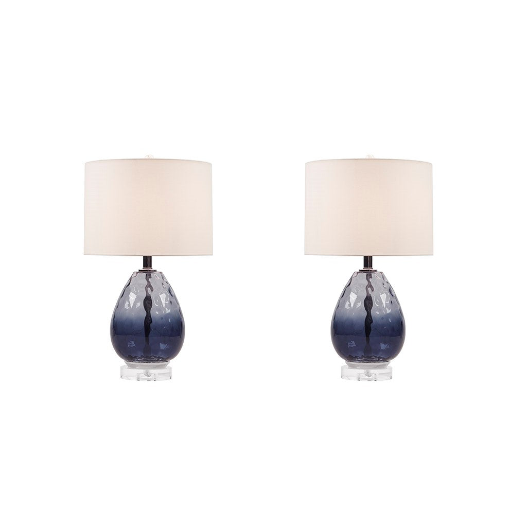 Urban Habitat Borel Table Lamp. Beautifully designed, this glass table lamp flaunts a blue hue that adds a soft touch of color to your room. The cream drum-shaped lamp shade tastefully accents the base, while softly filtering the light to give off a warm glow. It also has the ability to tilt, allowing you to easily focus the light. Plug in to a power source using the 72-inch clear cord and illuminate your decor by flipping the on/off switch located on the socket. Eye-catching and unique, this glass table lamp offers a chic update to your living room or bedroom. One spiral CFL light bulb is included. One 60-watt incandescent bulb or one spiral 13-watt CFL light bulb is needed. Comes with a 2-year warranty.