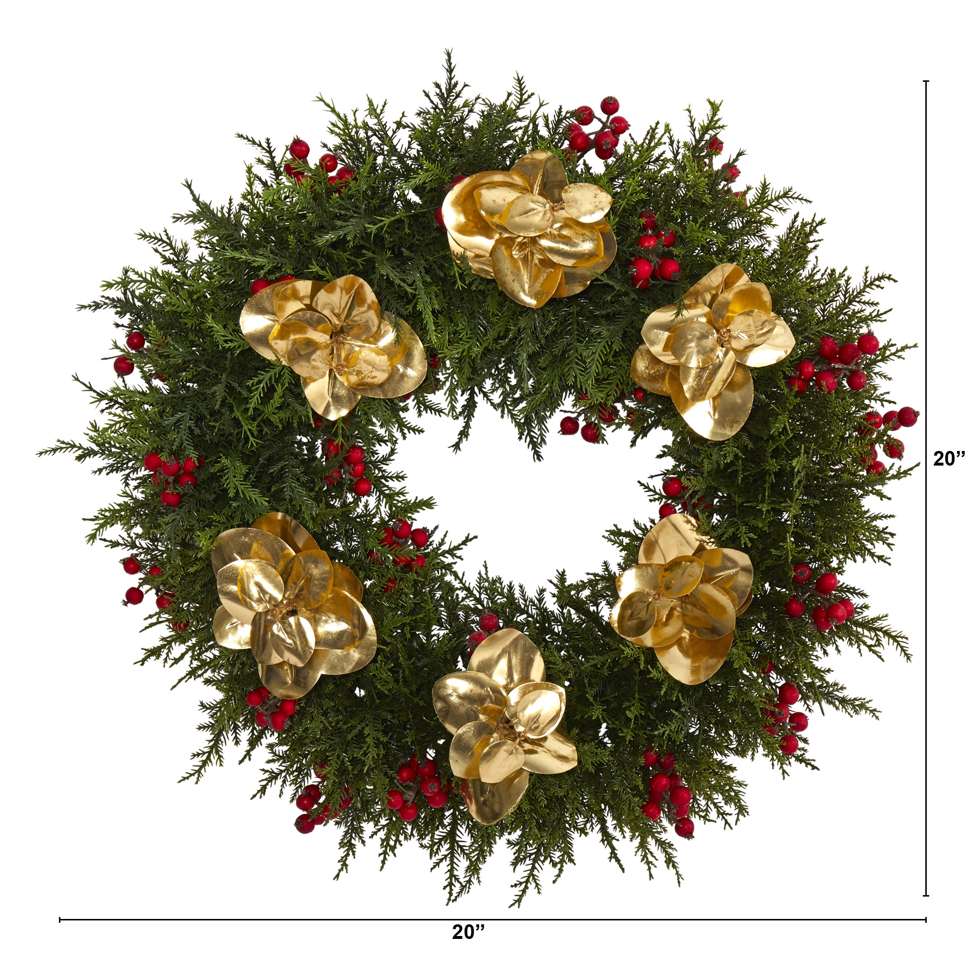 Showcase holiday greetings and cheer with the seasonal beauty provided by this artificial wreath intricately designed from cedar evergreens, handsomely complemented with eucalyptus sprays in a golden sheen and accented throughout with realistic looking berries. Great for seasonal display, this 20" (in circumference) decorative wreath makes for an inviting holiday accent and will undoubtedly transform your home's front-door appeal all season long.