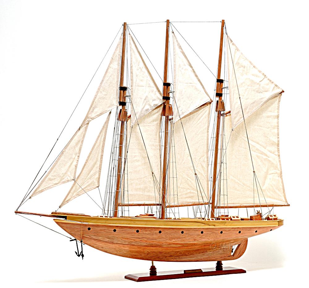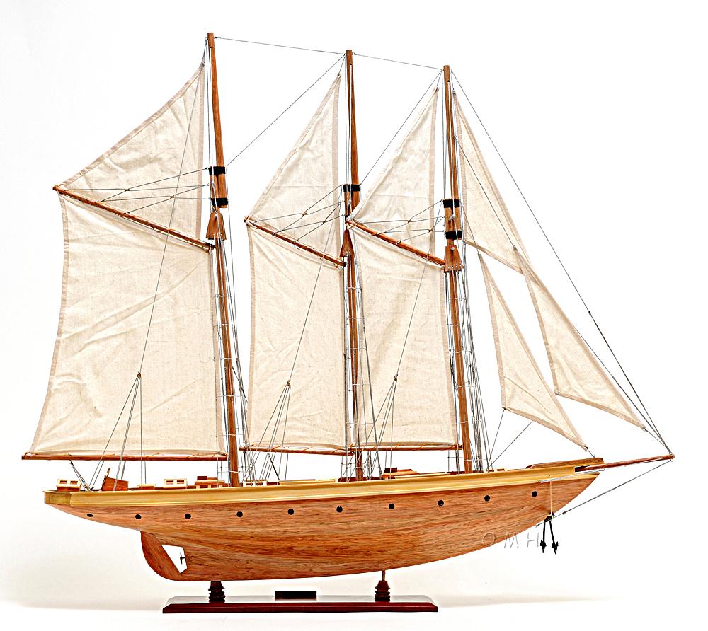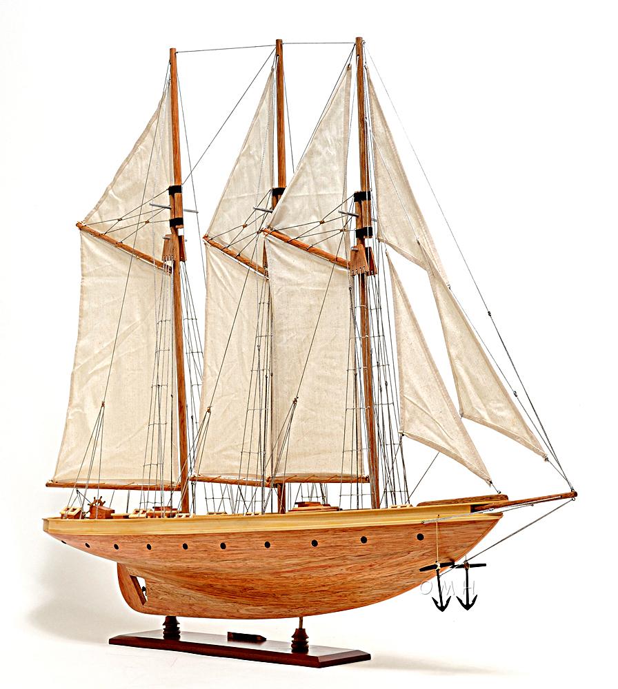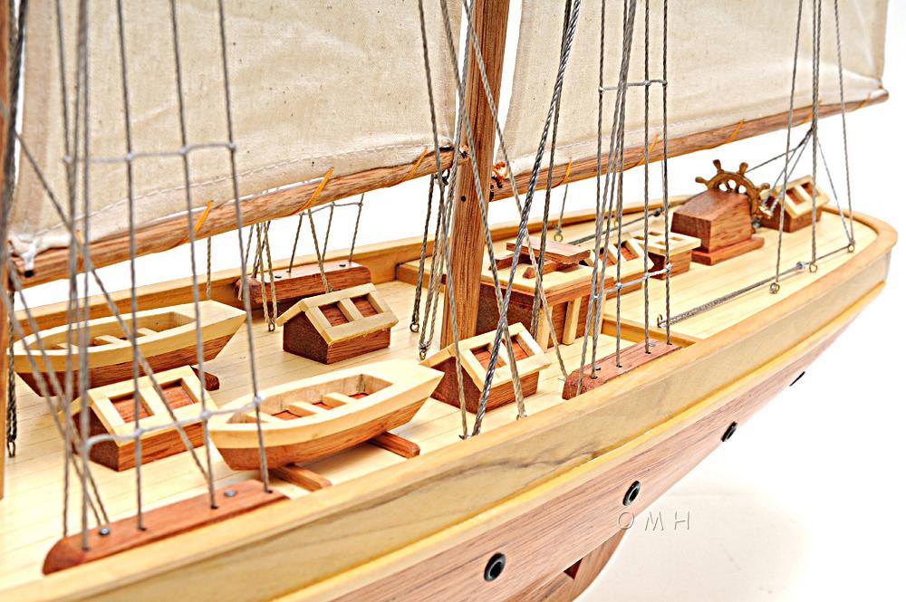 Our Atlantic Yacht model is scratched built using plank on frame from cherry wood and coated with clear varnished. The shines on the hull is truly beautiful. Pure wooden ornaments such as: wooden life boats, wooden bunkers, main masts with fabric sails and detailed stitching, all rigging are matching colors, metal anchors, metal propeller, many golden metal rings around the hull of the yacht, and many more. We absolutely use no plastic parts, only high quality wood and metal. This model is completely hand built by skillful and creative master craftsmen; you will be amazed at how real it looks. Our Atlantic Yacht model was built according to scale through original plans, pictures and drawings. The masts are fold flat down for shipping and has instruction guide how to set it up