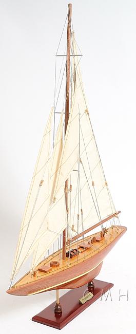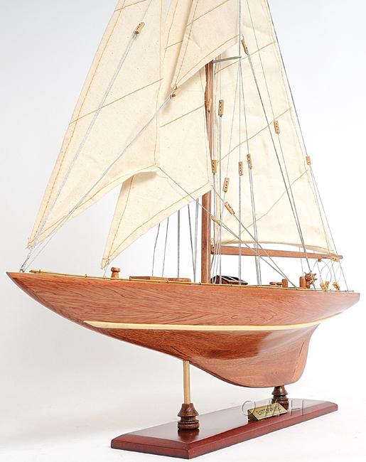 Our Enterprise Yacht model is scratched built plank on the frame by skillful and creative master craftsmen. Strip by strip of mahogany and teak were put together. It was built according to scale through original plans, pictures, and drawings. The hull is truly beautiful; It was carefully put together using the best material to create a smooth surface on both sides. On the yacht, you can easily locate gorgeous wooden parts and ornaments such as wooden mast, wooden boom, wooden bunkers, front and main sails with detailed stitching, wooden pole and metal steering, metal railing, and much more. We only use high-quality wood and metal to build the model, absolutely no plastic parts. This beautiful model is rested on a painted solid wooden stand. To enhanced value and recognition, a shiny metal plate embedded with “Enterprise 1930” is provided. This model arrives at your home with the mast folded down and will require some minor assembly such as setting up the mast and straightening out the riggings.