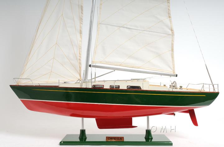 The Omega 46 is one of the most beautiful yachts on the water. The spacious interior has two large double rooms, one in the front, and one in the rear. Now you can have it displayed right into your own room or office. Master craftsmen handcraft these highly detailed wood models from scratch using historical photographs, drawings and original plan. They are built to scale with high-grade wood such as: western red cedar, rosewood, and mahogany. They are 100% hand built individually using plank-on-frame construction method and are similar to the building of actual ships. Each model requires hundreds of hours to finish and must go through a demanding quality control process before leaving the workshop. The Omega 46’s hull is painted beautifully in red and green with white waterline. The mast, boom and boom vang are painted in silver. The sails are meticulously stitched that extends all the way to the masthead. The model exhibits a double deck made out of wood from the inside cabin to the gunwale. Metal stanchions hold up the guardrails in place around the deck. There are also numerous details on the deck such as hatches, winches, metal steering wheel, cabin and companion way. The model is secured tightly on a painted wood base with a brass nameplate. It’ll make a perfect gift for home or office decorator, boat enthusiast, or passionate collector.