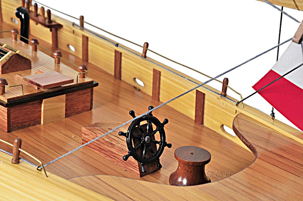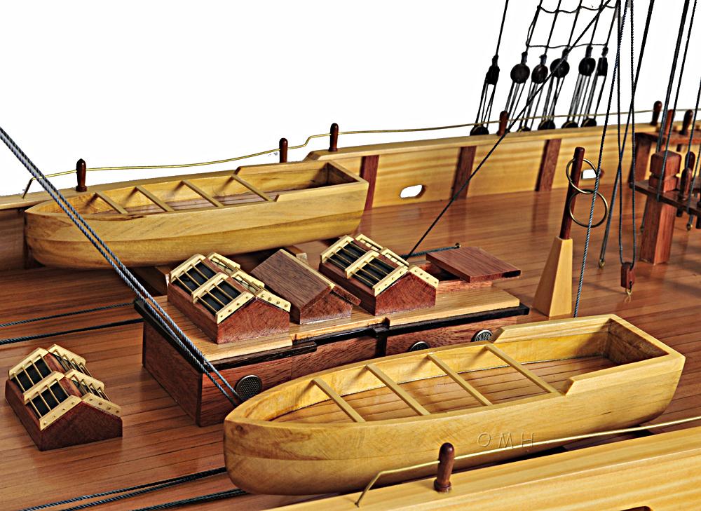 Capture the spirit of the high seas with a masterfully handcrafted, FULLY ASSEMBLED model of the Bluenose II, a storied fishing schooner that is depicted on Canadian dimes. Master craftsmen using historical photographs, drawings or original plans meticulously handcraft these highly detailed wood models from scratch. They are built to scale with high-grade wood such as: western red cedar, rosewood, and mahogany. They are 100% hand built individually using plank-on-frame construction method and are similar to the building of actual ships. Each model requires hundreds of hours to finish and must go through a demanding quality control process before leaving the workshop. The Bluenose II XL edition is beautifully painted in a rosewood color with an upper black hull. It has a main and foremast that are painted in yellow each with its own boom. All the sails are meticulously rigged to make up this magnificent sailboat. On the deck, there are authentic hand-built lifeboats with ribs and planks. The bowsprit goes through the gunwale that is hold securely to the bow by rigging. Cabins and companionways are located on the wooden deck. You will find metal anchors near the gunwale inside the two golden ornament piece of the Bluenose. This model is truly a remarkable representation of the Bluenose II. This model comes standard with a solid wood base and brass nameplate. The masts and sails are folded down for easy packaging and shipping. Assembly takes about 30 minutes or more depend on skill. It’ll make a perfect gift for home or office decorator, boat enthusiast or passionate collector.