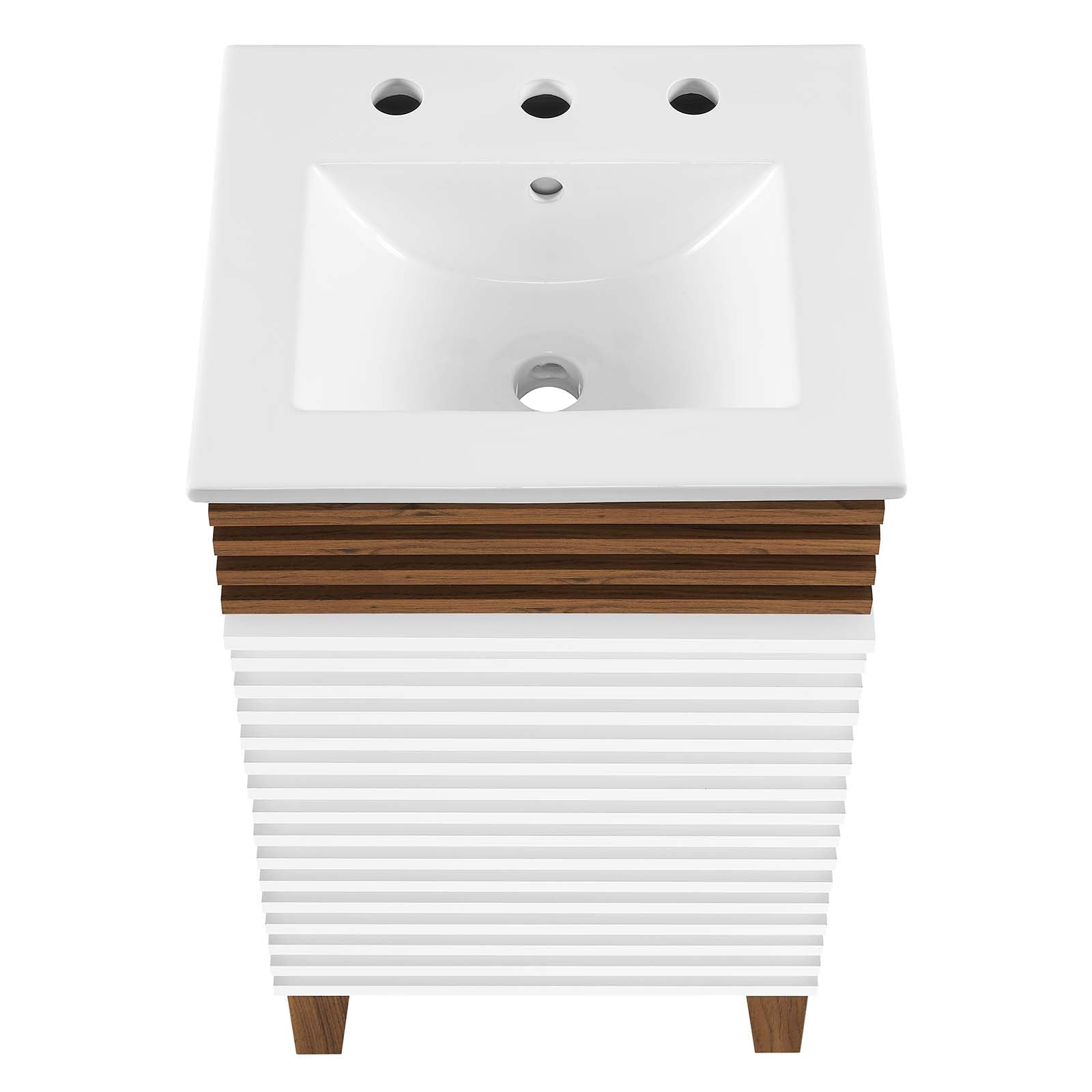 Tap into mid-century aesthetics with the Render Vanity. Render Bathroom Vanity features a durable particleboard frame with smooth laminate, four tapered wood legs, and adjustable storage shelf behind a soft-close hinged door. A curved ceramic basin and integrated countertop with three faucet holes create sleek lines and crisp design for an edgy style designed to meet your needs. Boasting a mid-century modern style this vanity features a solid construction with a pleasing look and practical functionality. 8" centerset faucet holes. Assembly required and fixtures not included. Set Includes: One - 18" Ceramic Basin Top One - 18" Vanity Cabinet