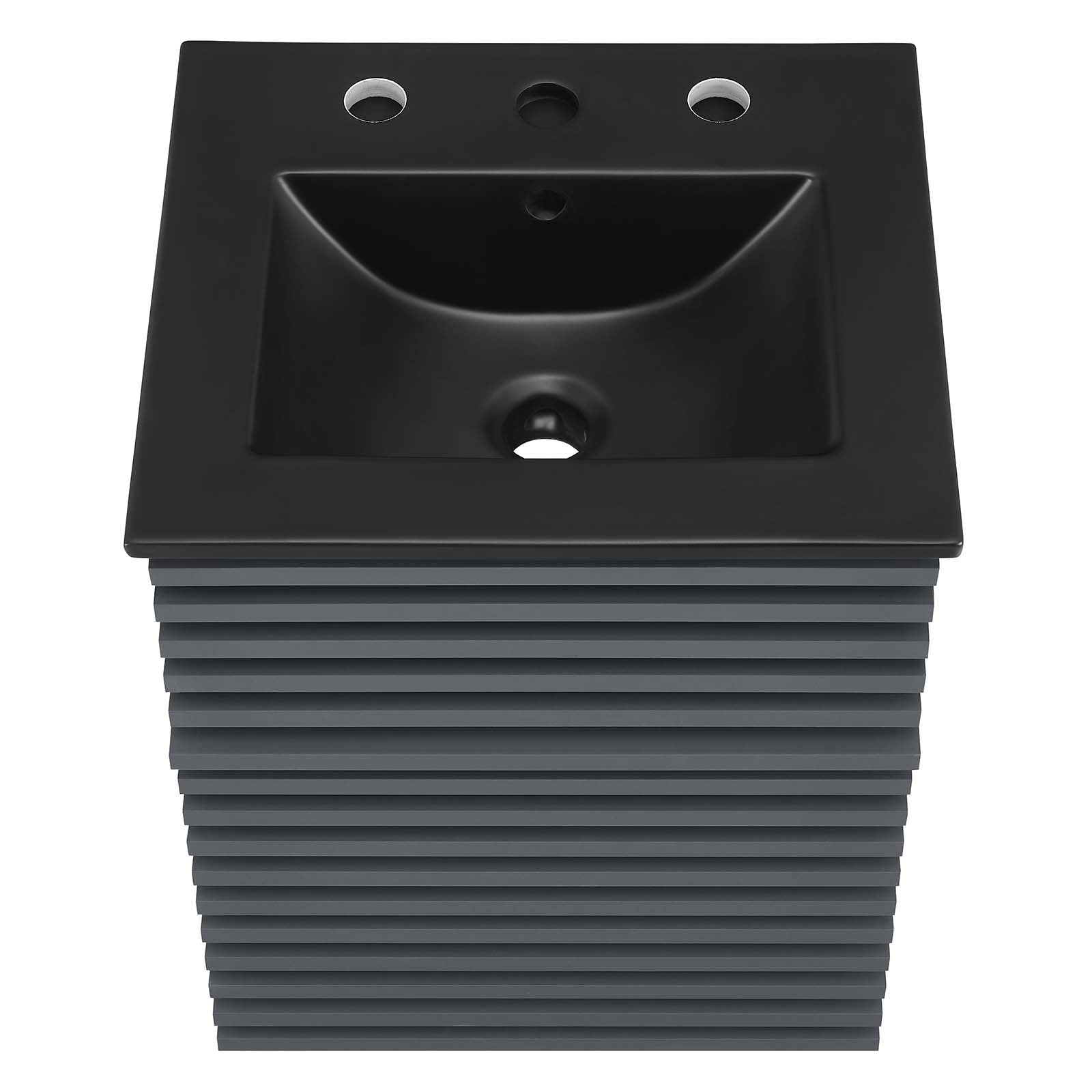 Tap into mid-century aesthetics with the Render Vanity. The Render 18" Bathroom Vanity features a durable MDF and particleboard frame with smooth walnut grain laminate, ample storage space in a full-extension drawer, and space-saving wall-mount design. Crafted with ceramic, a single sink with an integrated countertop, 8" centerset faucet holes, and rectangular sink basin continues the sleek look of this retro modern vanity. Clean lines and crisp design align for an edgy style designed to meet your needs. Boasting a mid-century modern style this vanity features a solid construction with a pleasing look and practical functionality. Assembly required and fixtures not included. Set Includes: One - 18" Ceramic Basin Top One - 18" Wall standing Vanity cabinet
