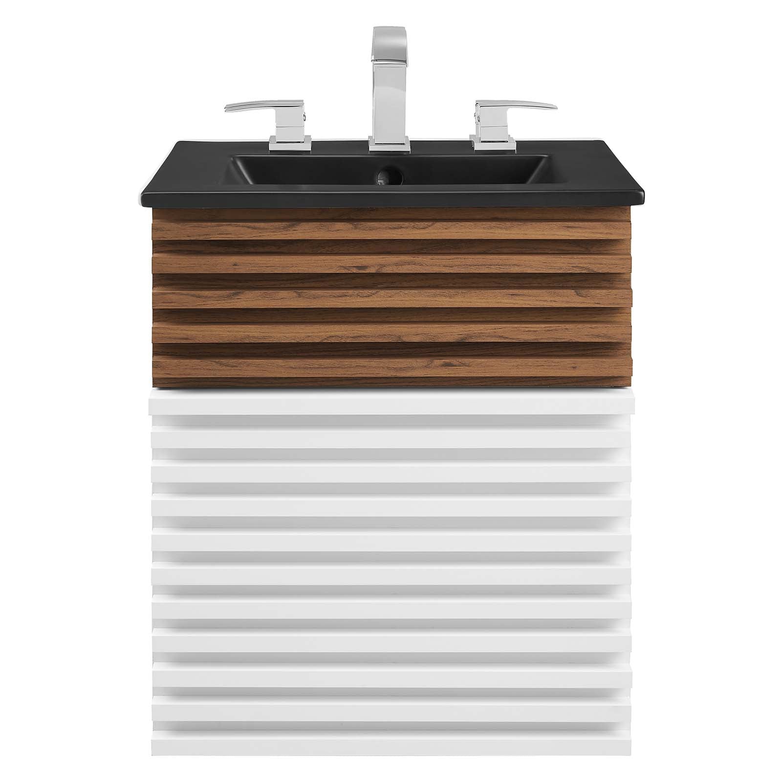 Tap into mid-century aesthetics with the Render Vanity. The Render 18" Bathroom Vanity features a durable MDF and particleboard frame with smooth walnut grain laminate, ample storage space in a full-extension drawer, and space-saving wall-mount design. Crafted with ceramic, a single sink with an integrated countertop, 8" centerset faucet holes, and rectangular sink basin continues the sleek look of this retro modern vanity. Clean lines and crisp design align for an edgy style designed to meet your needs. Boasting a mid-century modern style, this vanity features a solid construction with a pleasing look and practical functionality. Assembly required and fixtures not included. Set Includes: One - 18" Ceramic Basin Top One - 18" Vanity Cabinet