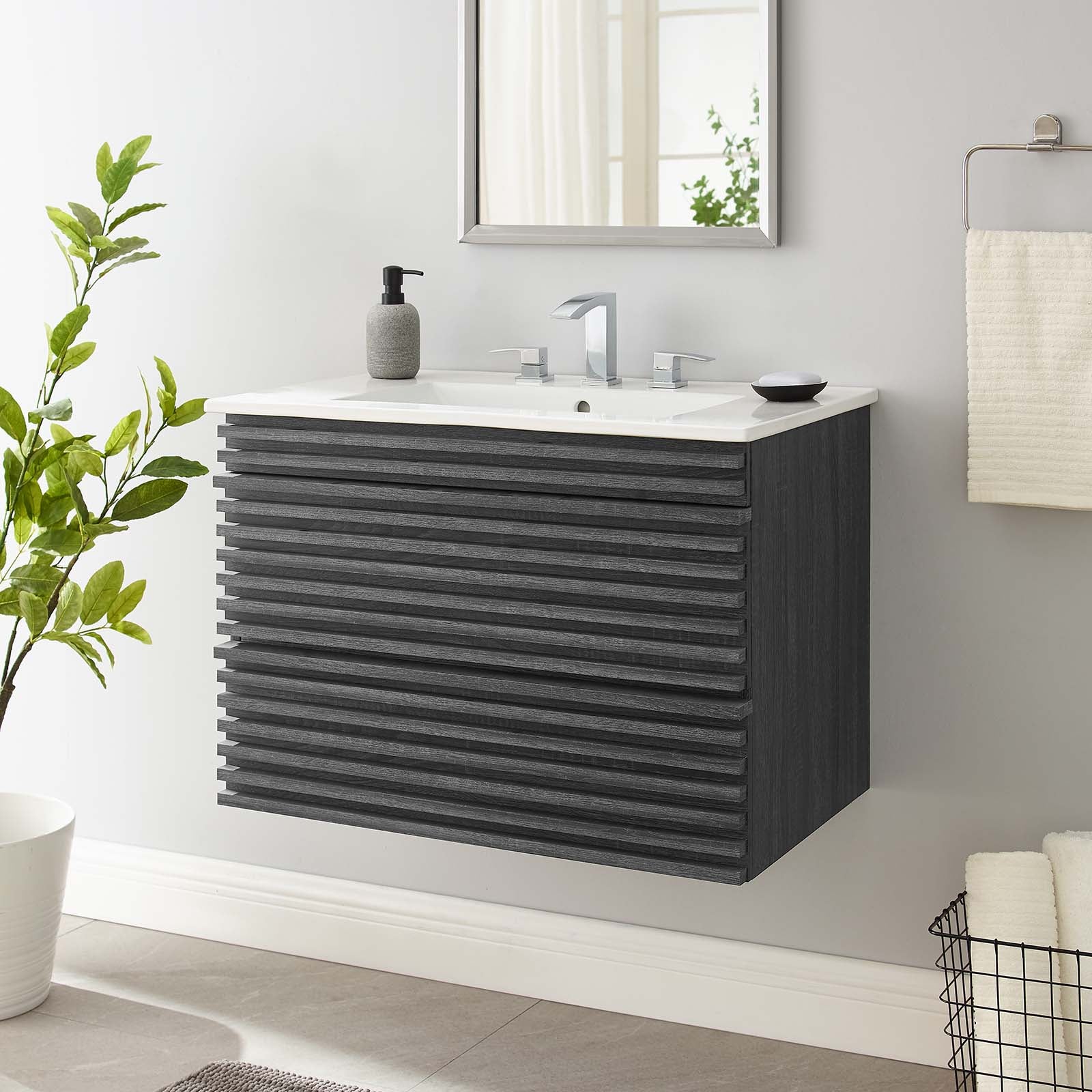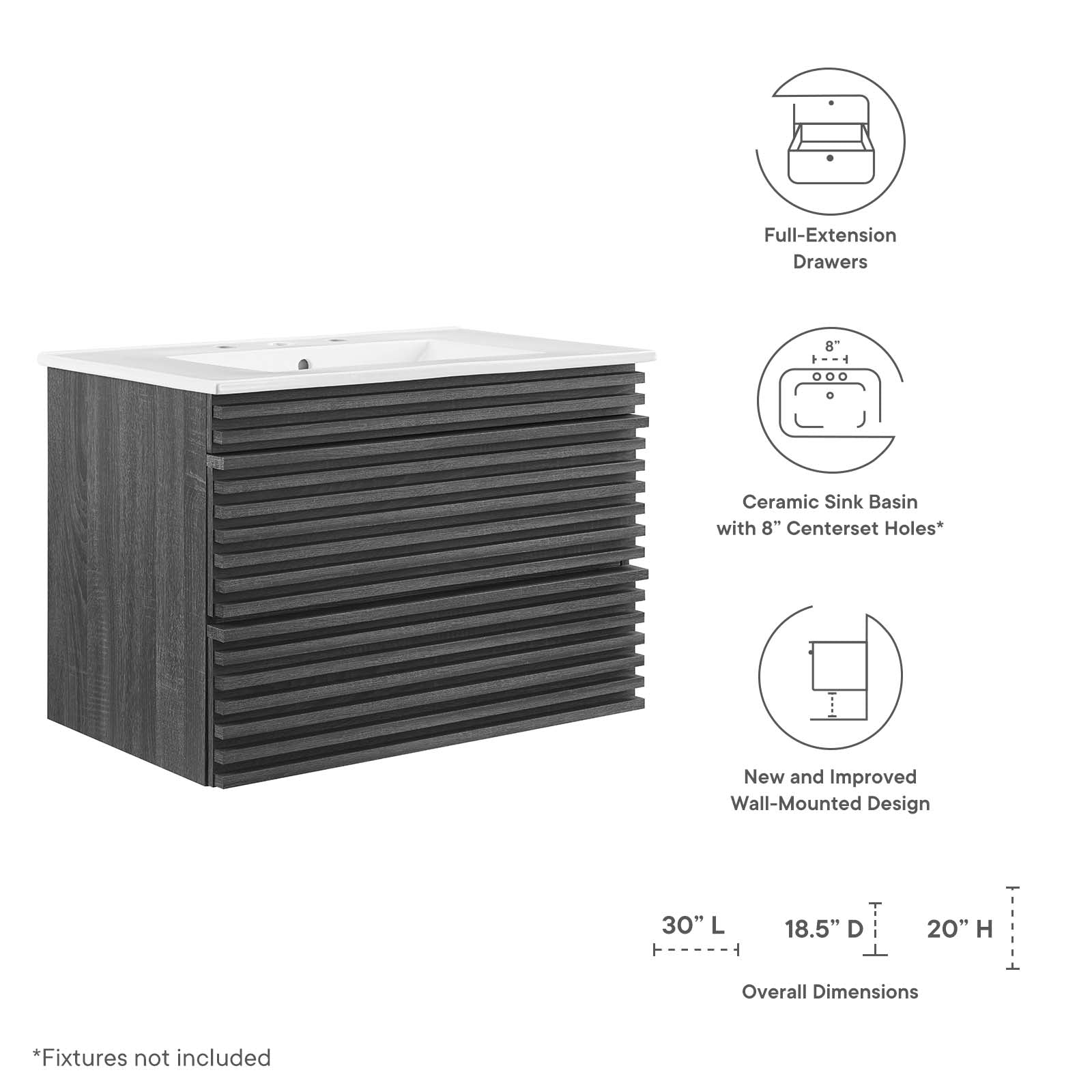 Tap into mid-century aesthetics with the Render Vanity. The Render 30" Bathroom Vanity features a durable MDF and particleboard frame with smooth walnut grain laminate, ample storage space in two full-extension drawers, and space-saving wall-mount design. Crafted with ceramic, a single sink with an integrated countertop, 8" centerset faucet holes, and rectangular sink basin continue the sleek look of this retro modern vanity. Clean lines and crisp design align for an edgy style designed to meet your needs. Boasting a mid-century modern style this vanity features a solid construction with a pleasing look and practical functionality. Assembly required and fixtures not included. Set Includes: One - 30" Ceramic Basin Top One - 30" Wall standing Vanity cabinet