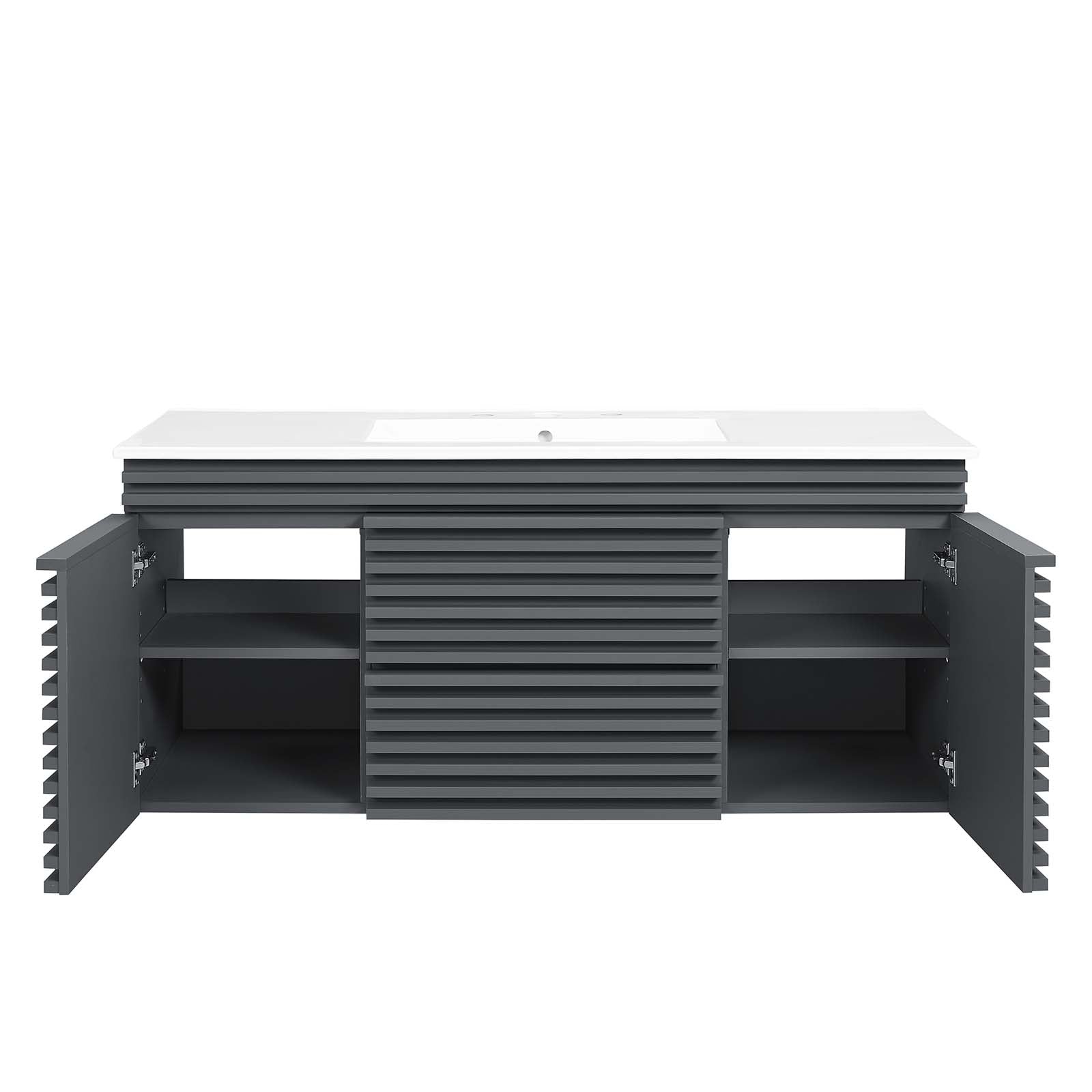 Tap into mid-century aesthetics with the Render Vanity. The Render 48" Single Sink Bathroom Vanity features a durable MDF and particleboard frame with a smooth laminate, ample storage space in two full-extension drawers, adjustable shelves behind soft-close hinged doors, and a space-saving wall-mount design. A curved ceramic basin with an integrated countertop and 8" centerset faucet holes creates sleek lines and a crisp design for an edgy look designed to meet your needs. Boasting a mid-century modern style this vanity features a solid construction with a pleasing look and practical functionality. Assembly required. Fixtures not included. Set Includes: One - 48" Ceramic Basin Top One - 48" Wall-Mount Bathroom Vanity Cabinet