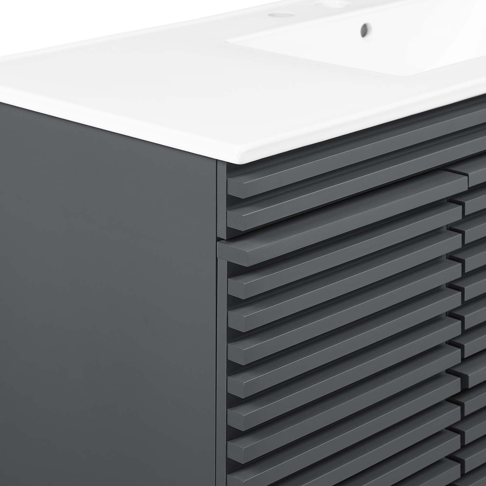 • Bullets: Mid-Century Modern Vanity Wall-Mount Design MDF and Particleboard Full-Extension Drawers Ceramic Sink Basin Fixtures Not Included